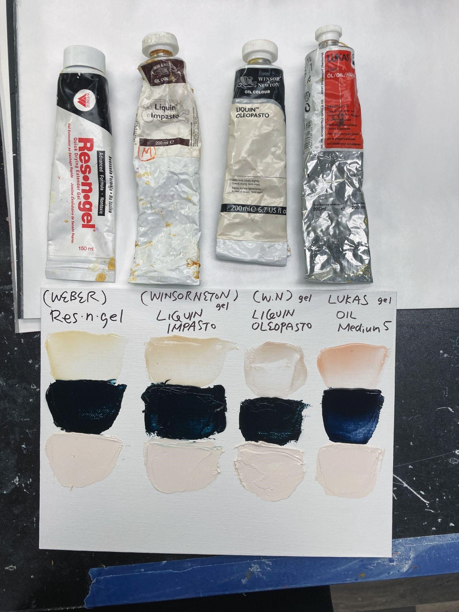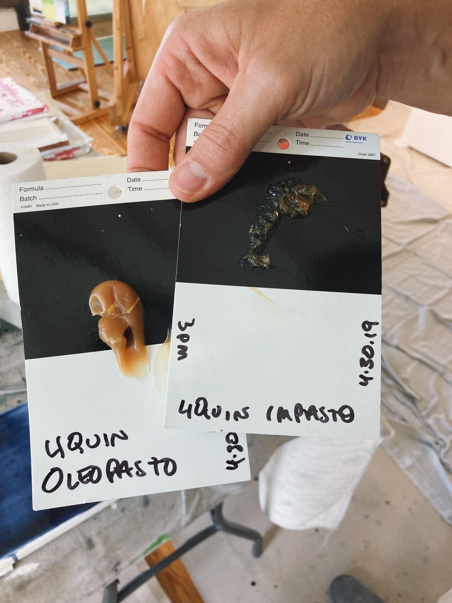 在這個一切都關乎壓克力的環境中,自大三開始專用油彩的我,意外地獲得特別的關懷與照顧。這次駐村才知道,發跡紐約布魯克林的Williamsberg油彩竟然也成為Golden公司旗下的品牌。據聞是原製作者Carl Plansky過世後,將品牌交由老友Mark Golden(現Golden執行長)接棒,於2010年納入Golden公司的生產線。負責油彩類別的專業人員名叫Greg,風趣健談,喜歡林布蘭的作品,濃密的棕色捲髮上總是戴著一頂繡著Williamsberg logo的棒球帽。他常突然變出一個裝滿試片的紙箱,邊說話邊翻找實驗結果。在看到我的畫面因沒有使用慣用材料而產生的皺褶狀態後,把手邊全部的醇酸樹脂(Alkyd resin)相關產品全掏出來供我做試片,希望我能找到合用的材料。雖然大部分的品項都沒有在台灣見過,卻體驗了美系油彩工作方法及一個Williamsberg專員的午後,非常過癮也非常感恩。