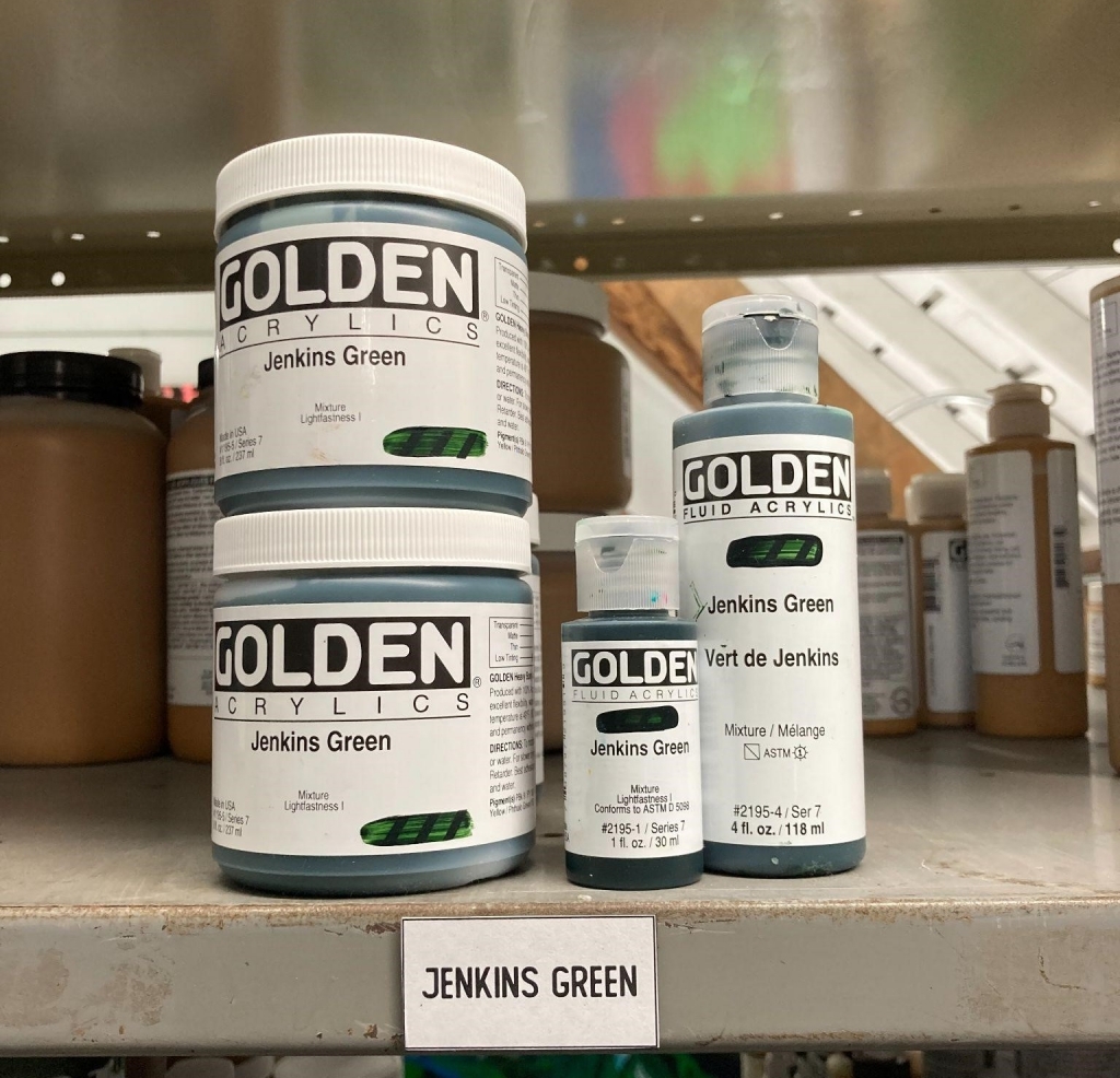註 上期曾提及Golden獨有的Jenkins Green是為美國抽象畫家Paul Jenkins專門訂製的顏色。色相介於樹綠(Sap Green)和胡克綠(Hooker’s Green)之間,和鈷綠(Cobalt Green)有一點像,又比鈷綠來得透光,是一個微妙的顏色。Golden家第三代、現任基金會負責人的Emma Golden曾分享,Jenkins與Golden家族於1980年代品牌草創階段便存在合作與支持關係。當時已享負盛名的Jenkins主動預付大筆顏料費用,溫柔地提供事業支持。為了紀念他,在徵得本人同意後,以Jenkins為名的Jenkins Green成為Golden生產線上的一條支流。