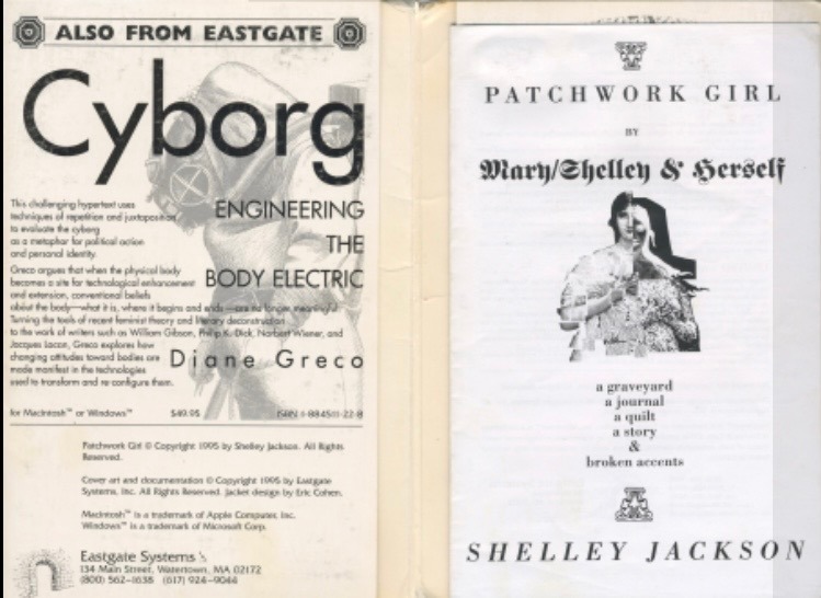 1995年,藝術家雪莉.傑克森(Shelley Jackson,1963–)的網路超文本創作《拼綴女孩》(Patchwork Girl),其原型即來自瑪麗.雪萊《科學怪人》書中的怪物。她部分是男性,部分是女性,部分是動物,已經175歲了。通過超文本技術,這個怪物被毀滅之後,又被瑪麗.雪萊自己縫回去,成為瑪麗的情人。此作品主題聚焦在怪異性、主體性和新的生產技術。當讀者或用戶打開超文本,會出現一張傷痕累累的裸女身體圖片,與一條虛線縫合在一起。點擊身體進入文本,按下「四肢」或其他節點,可連到文本的不同部分。