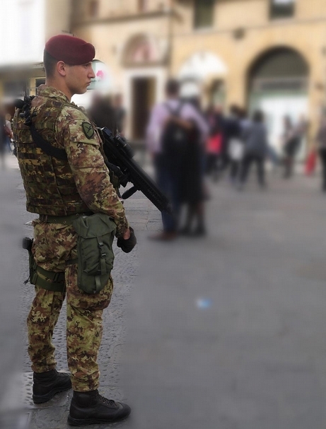 歐洲恐攻危機升高後,義大利重要的文化機構外常有荷槍實彈的士兵巡邏。(攝影/黃心蓉)