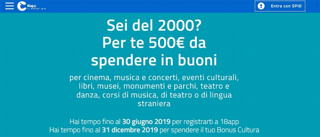 18app的首頁催促2000年出生的義大利公民,如果尚未領取「文化紅利」(Bonus Cultura),一定得在2019年6月30號前完成登記,2019年12月31號前使用完畢。(18app網站截圖)