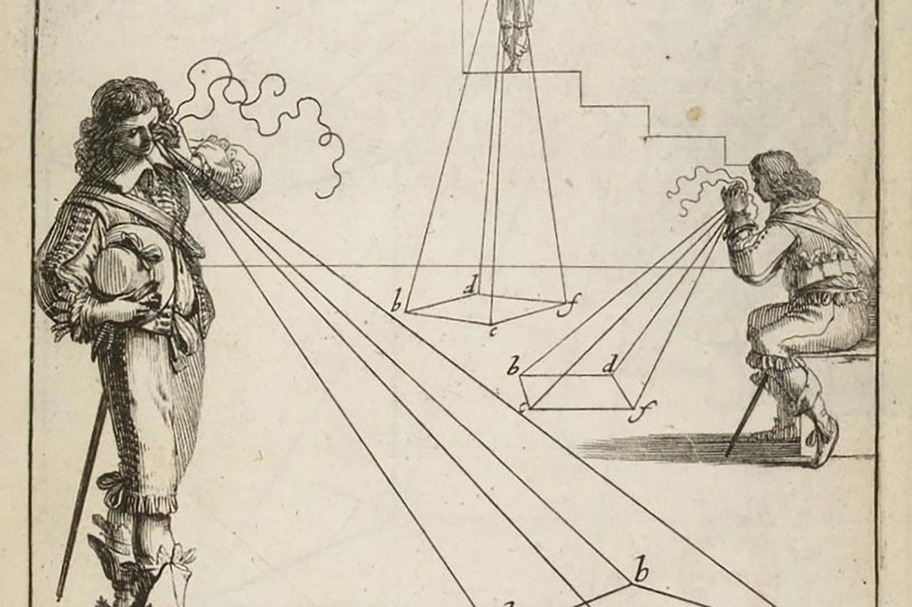 譬如在阿布罕.伯斯(Abraham Bosse)1648年出版的透視法專書中,原本代表「視線」的線條被畫成了像是被觀者捻在手指之間的絲線。在這邊,從眼睛投射出去的「視線」像是被拉緊、繃直的細線,在地面上畫下了框線。