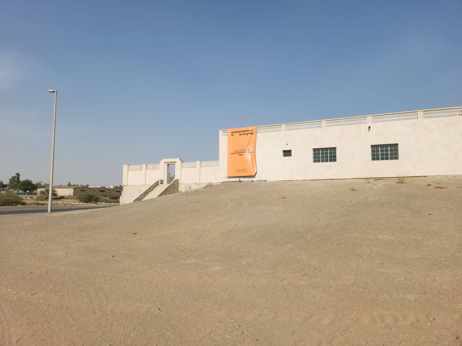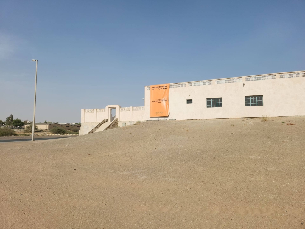 沿著E88公路朝沙漠中駛去,雖然這並非筆者首次於阿拉伯聯合大公國的沙漠中急駛,但比起上回於阿布達比邦駛向著名綠洲艾爾-阿茵(Al Ain),沙迦邦的沙丘顯得更為壯觀:彷彿是在高溫中自我燃燒且綿延不絕的火舌。在約略一小時之後,便抵達了綠洲小鎮艾爾-達依德(Al Dhaid)。該鎮是第15屆沙迦雙年展(Sharjah Biennial 15)「歷史性的思考當下」(Thinking Historically in the Present)的眾多展場之一。