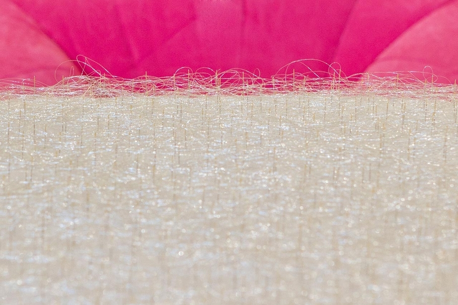 《生活是甜蜜》書封作品圖為陳慧嶠裝置作品《雲端》,由12座桃紅沙發圍繞密織了銀蔥線的鋪棉圓桌。(陳慧嶠提供)