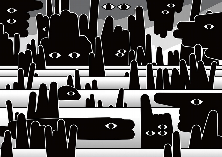 明亮如白晝之處沒有、也有,墨色如暗夜之處沒有、也有;沒有人真正見過調控者的肉身,可以是你、可以是我、可以是他、可以是幻影,可以是成千上萬的意識形態總和;這座島嶼上的人啊,享受雙手一伸變成了狗、變成了魚、變成了狼的影子遊戲,冷涼、暗黑又無聲無息,總是像擋住太陽那樣從指縫窺視燭火的光,其實一清二楚卻又顯得模糊、震耳欲聾卻似一片寂靜,時刻都活在與他/他們睜大雙眼、四目交接的幻見之中,寧願將日子過得像薛西弗斯推石頭上山的神話,到頭來只剩荒謬與徒勞;所以「銷聲的宇宙」(Muted Cosmos)也可以是你我身為另一位代號「MC」的調控者想像(吧)。