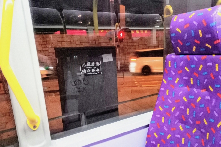 香港街道上,貼著「時代革命,光復香港」口號標語。(攝影/梁寶山)