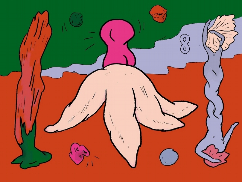 我記得某些科學研究認為,人魚可能是在古猿進化成早期人類的過程中,在水中生活的一個分支,在進化過程中已經被遺忘,而以神話的形式留存了下來。雖然看完文章時滿腦子都是美人魚,但最初是想畫一個交媾的場景:無毛的人猿躺在海灘上互摸對方的雞雞,怎知一下筆就有點失控,最後變成你們現在看到的這坨蚌殼肉般的東西。