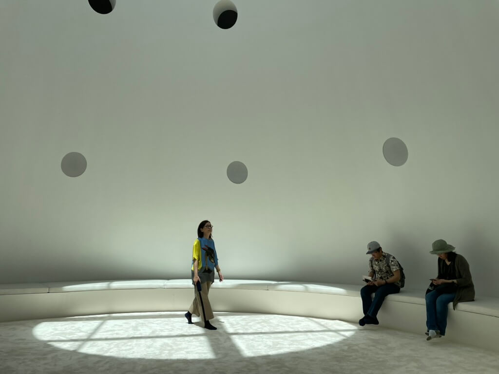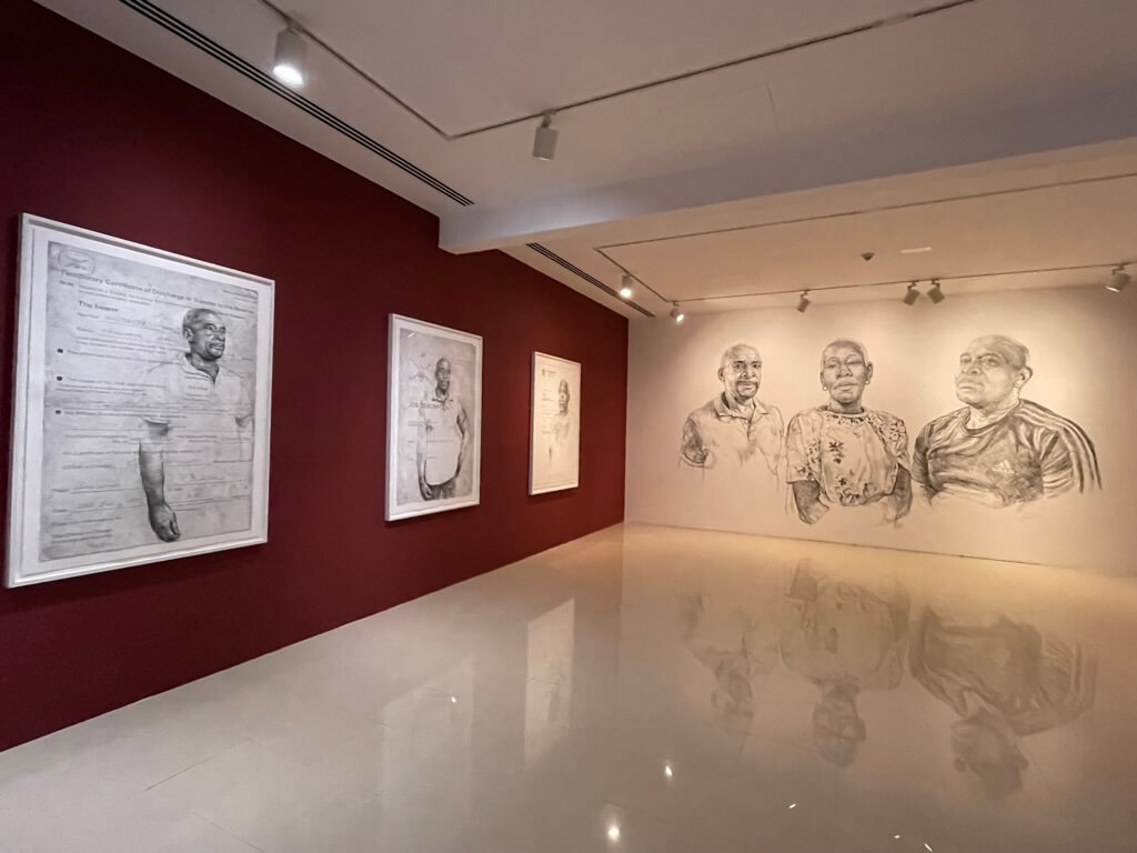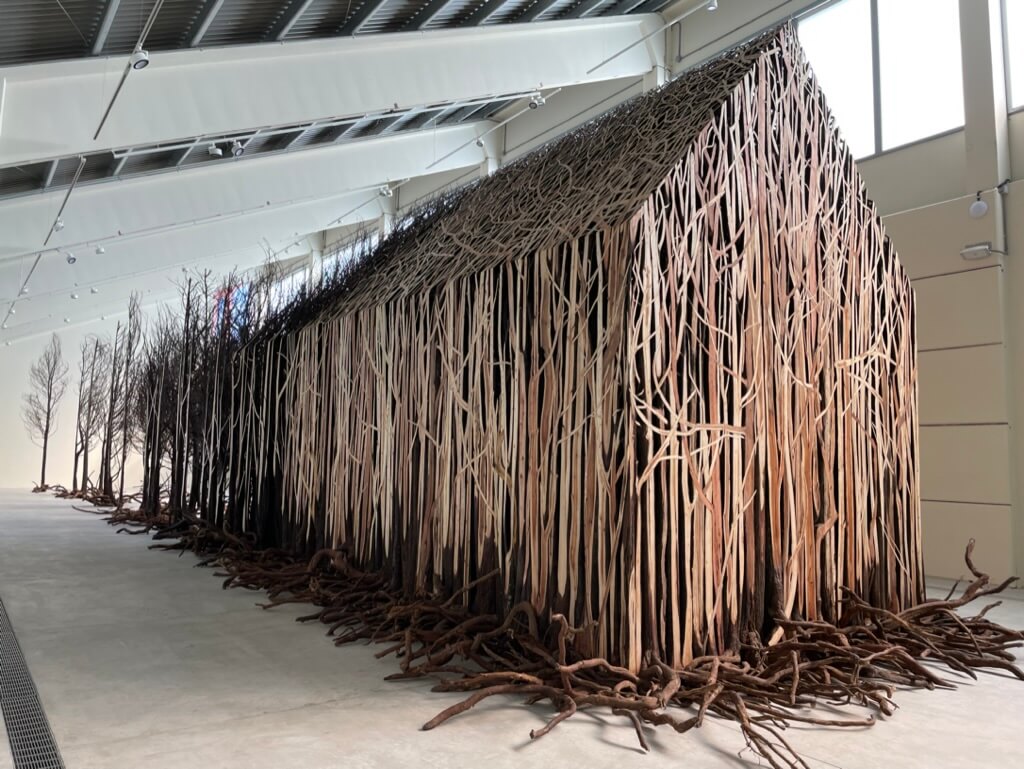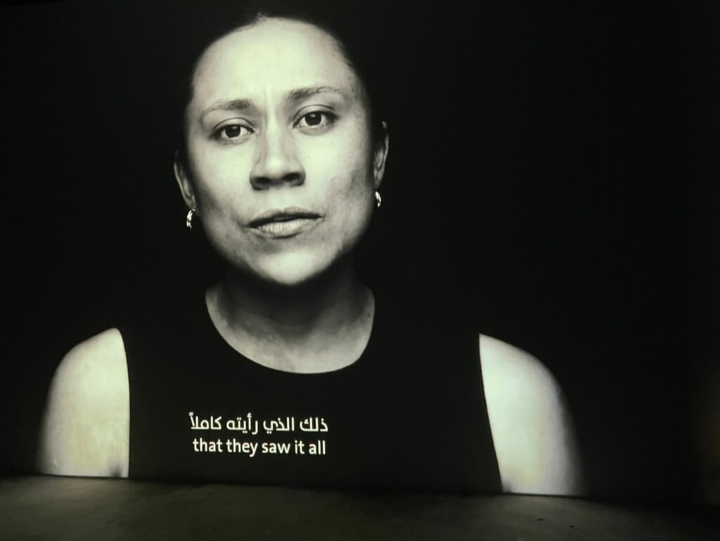 另外,國際知名的哥倫比亞女性藝術家Doris Salcedo在廢棄冰廠的作品《Uprooted》, 贏得此次沙迦雙年展大獎,她採用804棵死去的樹木的裝置作品,呈現「家」的流離失所,並觸及氣候變遷等生態議題。另一位贏得沙迦雙年展大獎的女性藝術家Hajra Waheed,作品 《Hum II》建構一個巨大純白的倒漏斗狀的聆聽空間,觀眾進入沈浸式空間,人的身體被聲音所包圍,而這些沒有語言的人聲哼唱,其實是出自於一首首的抗議歌曲,藝術家將歌詞抹除、重組、編曲,展現社會運動中女性領導者面臨的壓迫,以及他們的抗爭參與幾乎不被看見的事實。這些作品提供全球視野,也擴大殖民/後殖民的相關討論。