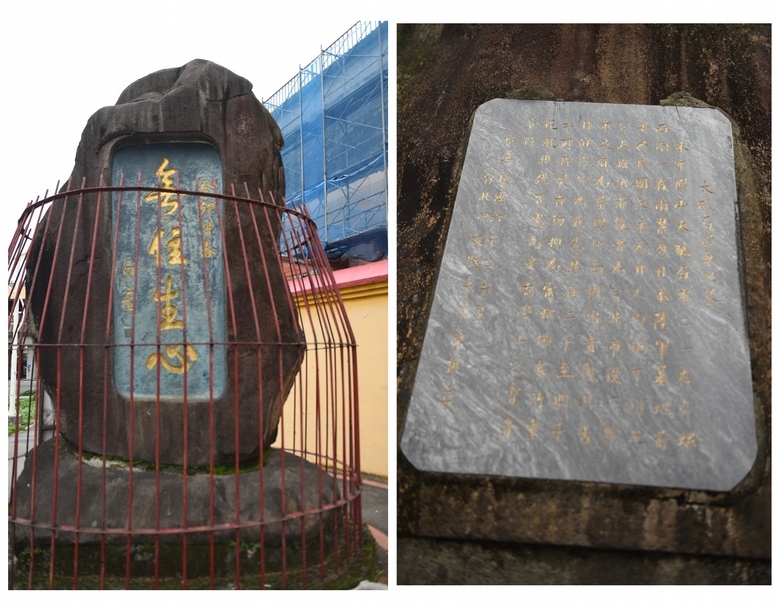 左圖:疑似被誤認為大砥石的「無住生心」石。右圖:「無住生心」石背面被臺北市文獻委員會勘入大理石碑,碑文指「無住生心」石為大砥石。(蕭文杰提供)