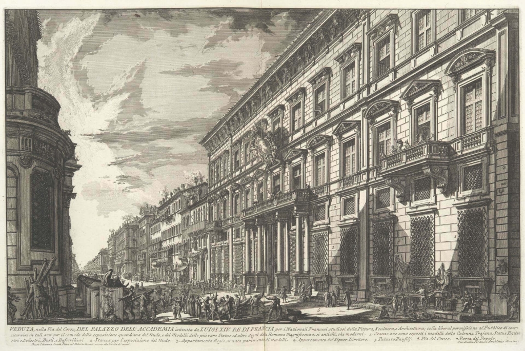 位於羅馬的法蘭西學院最早創設於卡普拉尼卡宮(Palazzo Capranica),後於18世紀初遷至曼契尼宮(Palazzo Mancini)。法蘭西學院基本上就是法國政府於羅馬直接購置的資產,獲得「羅馬獎」的學生則被稱為「學院獲補助者」(Pensionnaires de l’Académie)。早期的法蘭西學院除了提供獲補助者食宿及工作室外,最重要的是這些學生得以在「永恆之城」於沒有經濟壓力的情境下自由學習羅馬所能提供的各類新、舊知識,進而成為年輕藝術學生邁向成為專業藝術家路途中重要的職涯經歷。我們可以說,「羅馬獎」的設計已經具備了當代駐村機制的所有原型。到了18世紀初時,皇家建築學院(Académie Royale d’Architecture)亦開始選拔「羅馬獎」得主。在18世紀時,「羅馬獎」每年定額選送6名畫家、4名雕刻家及2名建築師去羅馬「駐村」。