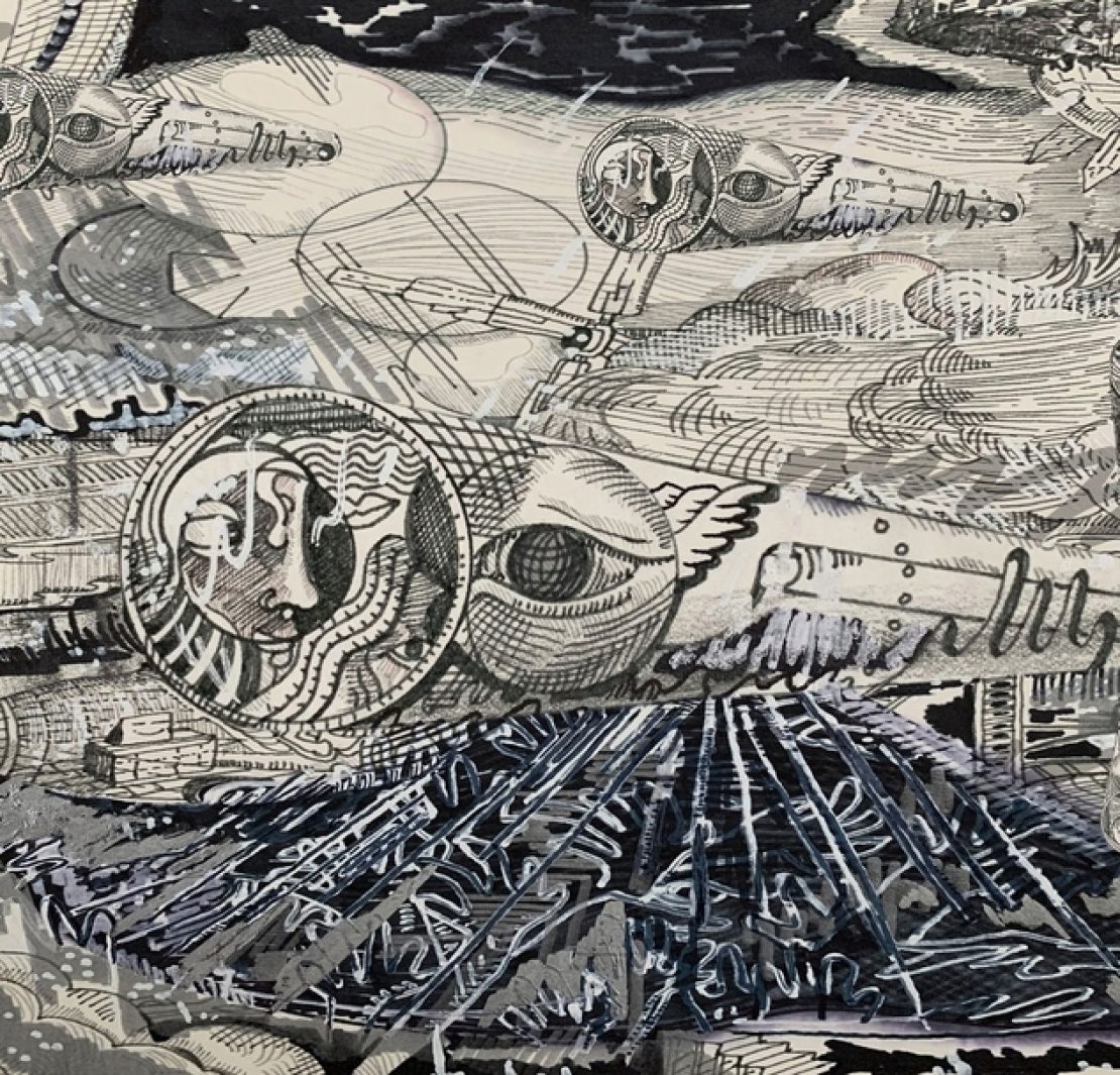 讀著拉普塔的文章與重新看了《天空之城》,文字與影像畫面,指引著我描繪出文章的配圖。巨大的望遠鏡造型物也象徵著拉普塔人與地面人的慾望,漂浮著伺機浮現。人類對於未知的事物,總是有著無比探求的慾望,慾望的無限上綱可帶來毀滅,或是創造出新的世界。對應著現今疫情的時代,自覺就好像身處於新舊交替的時空,迫使你改變、放下、造夢、擬構這不曾去過的拉普塔,以及只往前的下一步。
