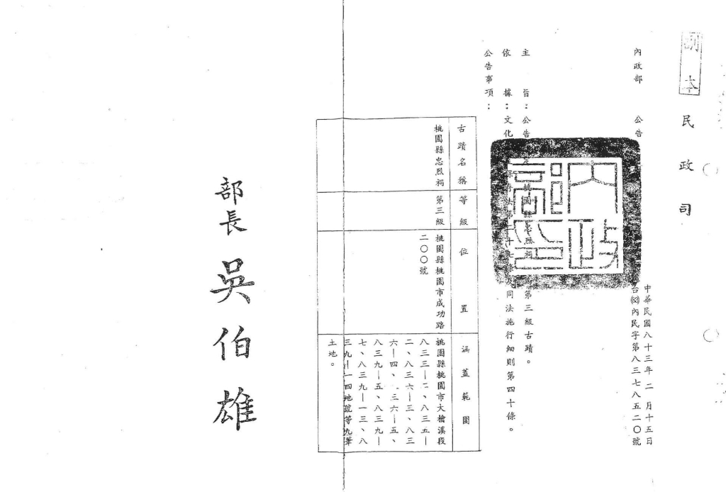 不過到了1990年代,文化資產保存在面對社會的衝擊之下,價值觀逐漸產生了一些改變,桃園神社在地方議會決定保留之後,就在李登輝擔任總統開始走向本土化任內,內政部在1994年桃園神社以「桃園忠烈祠」之名,公告為三級古蹟。試問1994年內政部的文資審議有所謂「新事證」嗎?是否符合《文資法》發揚中華文化為宗旨,其實也是官字兩個口,怎麼說都是官方對。林衡道也在1994年轉向支持原日本赤十字社臺灣支部的建築保留(戰後成為國民黨中央黨部)。而類似狀況是1998年內政部將日治時期建築的總統府、監察院、臺北賓館、司法院指定為國定古蹟,巧妙的是由登錄公告分析,是沒有說明理由,事後國家文化資產網站的詮釋,也刻意強調1949年國民政府遷臺後,作為國民黨政權來臺後,繼續維持其權力核心的角色。例如總統府就特別指出:「1948年底大修完成,原辦公室配合慶祝蔣中正總統六十大壽,改稱為『介壽館』。」