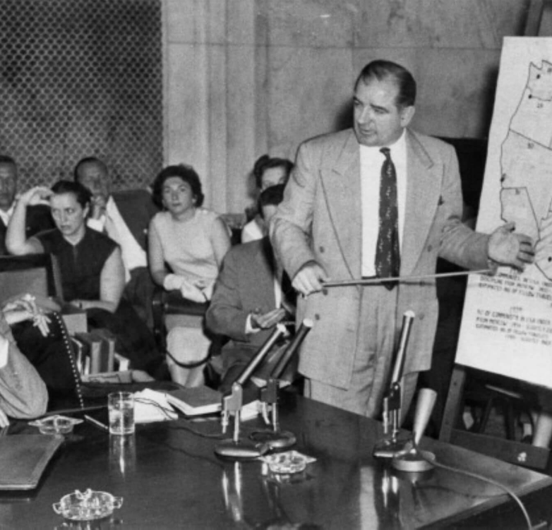 日裔美國藝術家國吉康雄(Yasuo Kuniyoshi, 1889–1953)可以說是麥卡錫主義早期的受害者之一,國吉康雄於1906年17歲時移民美國。二戰期間透過積極協助美軍描繪反日海報,雖免於關押在惡名昭彰的日裔集中營中;但其亦被限制住居城市且相機遭到政府沒收。1947年,時任總統杜魯門參觀其畫作時曾批評:「這名畫家一定是站在畫布上亂潑顏料…如果這就是藝術,那我就是霍屯督人(Hottentot)。」(註1)因為杜魯門的評論,包括國吉康雄在內,原定由多位美國新銳藝術家所組成的國際巡迴聯展,於麥卡錫主義時期被審查並取消展出。美國國會的藝術審查亦曾劍指1930年代引入美國的墨西哥壁畫,以及當時因為羅斯福新政時期(The New Deal)而廣泛設置的大型公共壁畫。