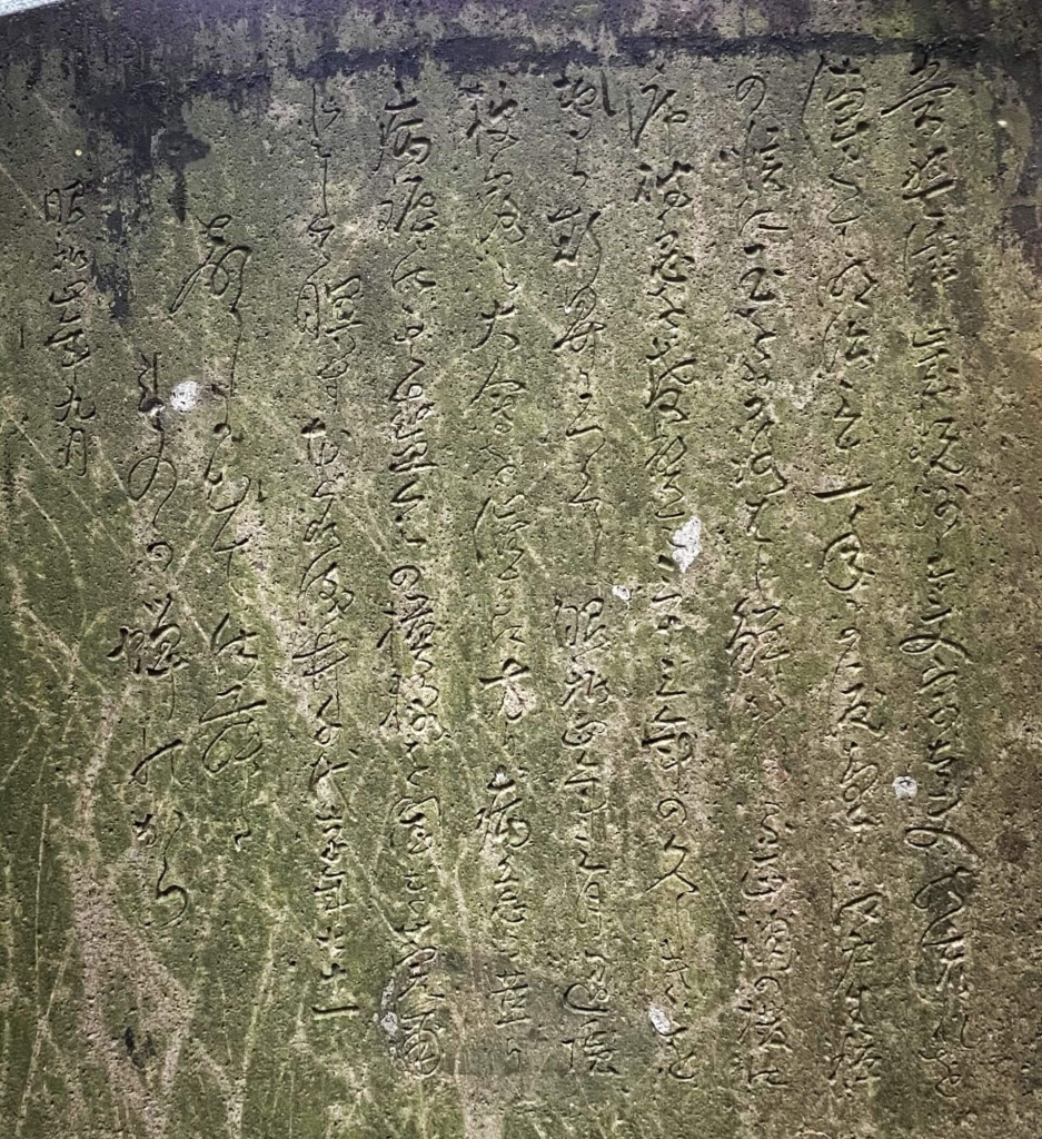 不過,若仔細解讀石碑下方斑駁的圖案,以及走到石碑背後細讀碑上刻寫的日語草書文章,可以發現事情並非如此。