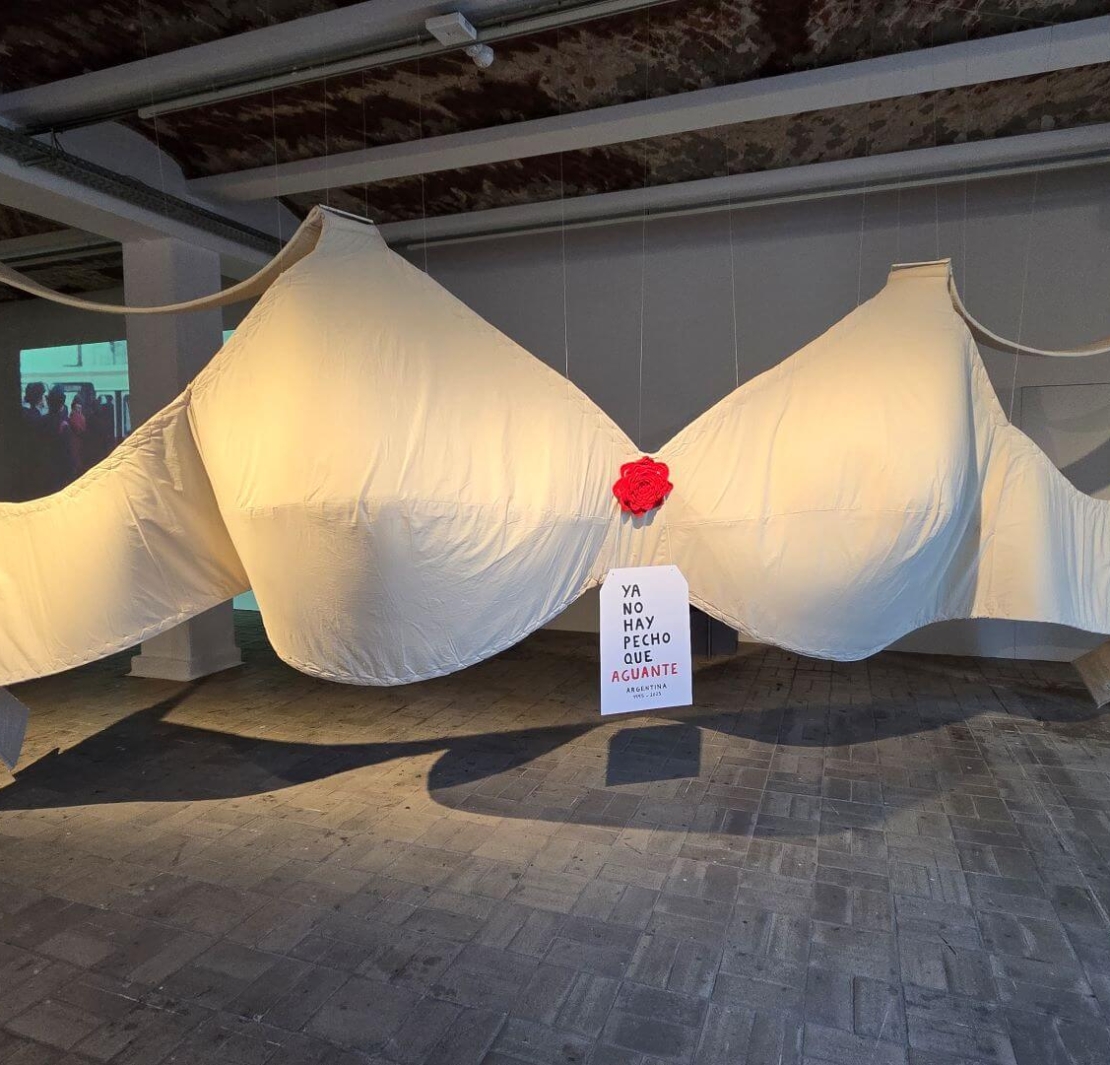 在KW當代藝術中心可以看到不少行動主義者(activists)的藝術表現形式,令人印象深刻的作品還包括不少女性主義觀點的創作:譬如「和平小褲褲」(Panties for Peace)的創作作品非常直白,且與其團隊名稱完全一致。該團隊的作品呈現出各種女性內褲的圖形,並藉此強調女性本身所蘊含的反戰身體。和「小褲褲」互相呼應,則是阿根廷藝術家奇奇.洛卡(Kikí´Roca)的裝置作品《胸罩》(El Corpiño)。藝術家將巨大化的胸罩造型裝置擺放在展場之中,形成了不可忽視的壓倒性存在。這座巨大的胸罩裝置上還書寫了一段阿根廷諺語「我已無胸部可以撐了」(Ya no hay pecho que aguante),意為「忍無可忍」或是「ㄍㄧㄥ不下去」。諺語下方寫上「阿根廷1995-2025」,其對於國家經濟失敗的控訴呼之欲出。