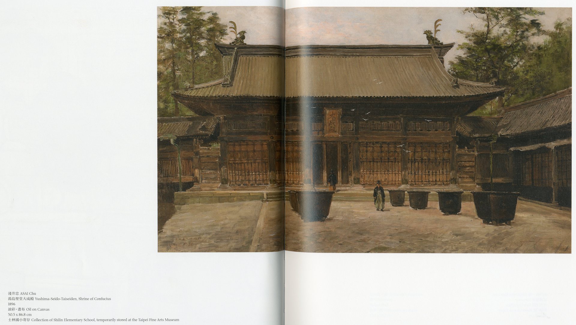 時間先回到2015年,臺北市立美術館「臺灣製造.製造臺灣:臺北市立美術館典藏展」展出一件十分特殊的油畫:淺井忠《湯島聖堂大成殿》。根據北美館的資料,《湯島聖堂大成殿》原先藏於士林國小,自1896年左右起收藏迄今。