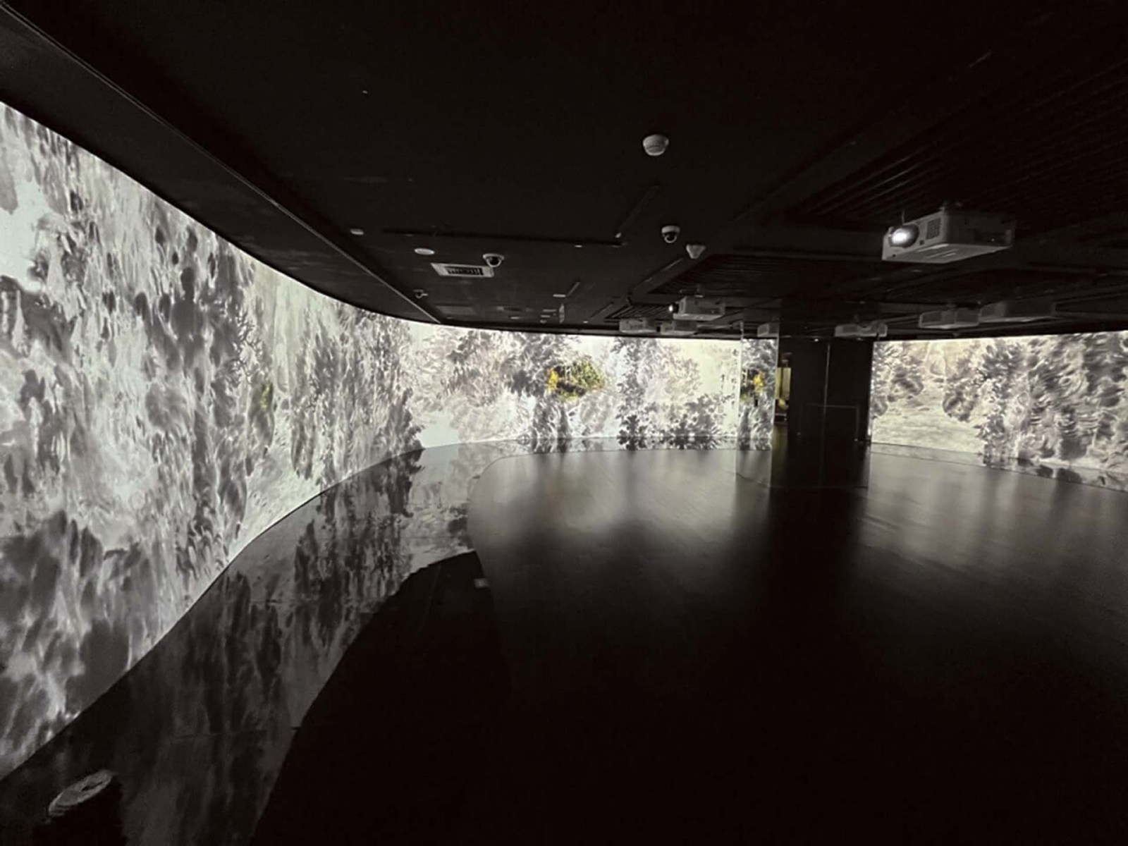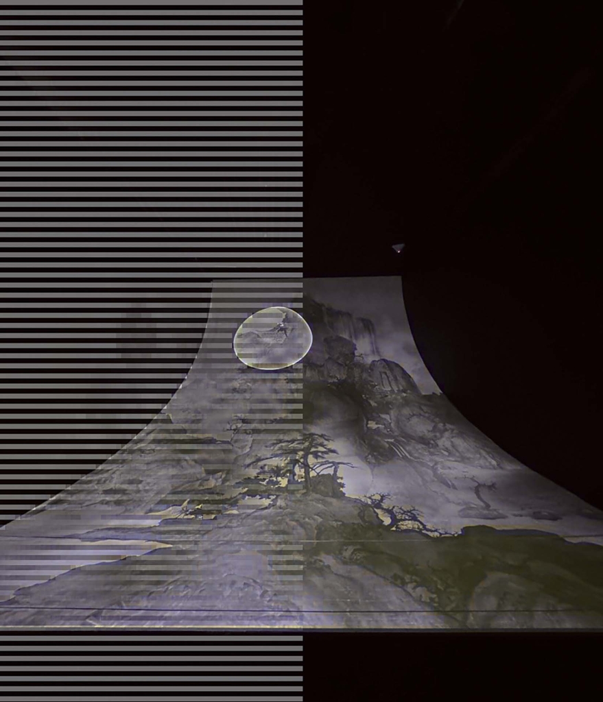 以教育與推廣為生產目的,「沉浸式山水」的製造,最常見的便是虛擬實境與沉浸式體驗。這些山水不在於創作者的主體實踐,而是透過技術研究,期能打破平面章法,提供一個虛擬自然,且能容納宇宙觀的人造景觀。2022年威尼斯雙年展中的中國館主題為「元境」(Meta-Scape),曾彰顯了「人—技術—自然」的年代境況。(註2)此展直接將山水之境視為一種原理性觀念。團隊從「元」(Meta)的概念出發,以人工智慧的新媒體藝術實踐為主要媒介,提出「人工造境」的符號元素與美學形式。在將山水概念化與結構化之下,呈現出的山水觀是─它需要擁有植物、山石、雲霧等符號形象,需要呈現情與景、虛與實、心與物的二元相對關係。因科技使用,這些景觀可以出現立體影視般的視效。