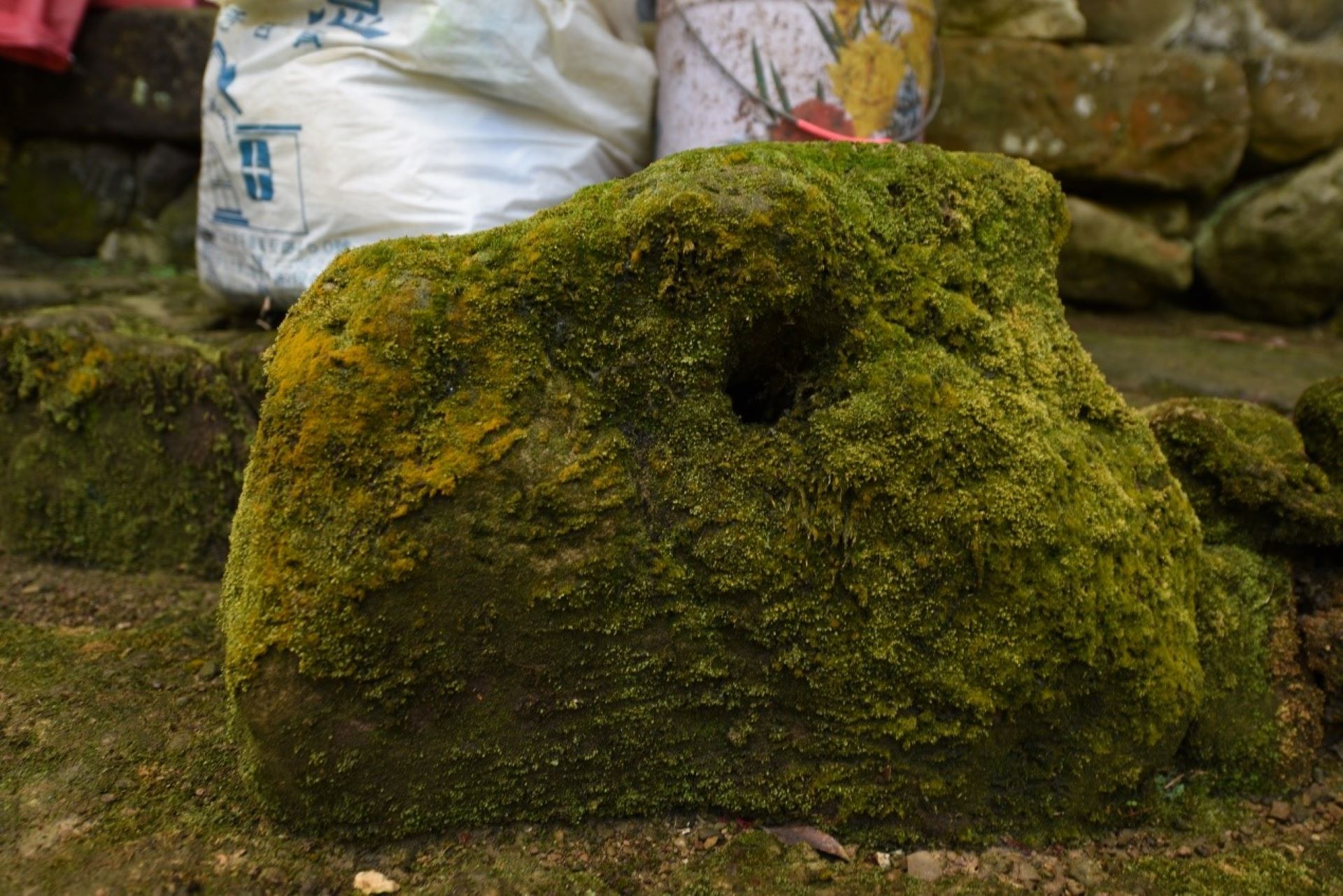 林家草厝的建築基石,屋主稱「地靈公」。(攝影/蕭文杰)