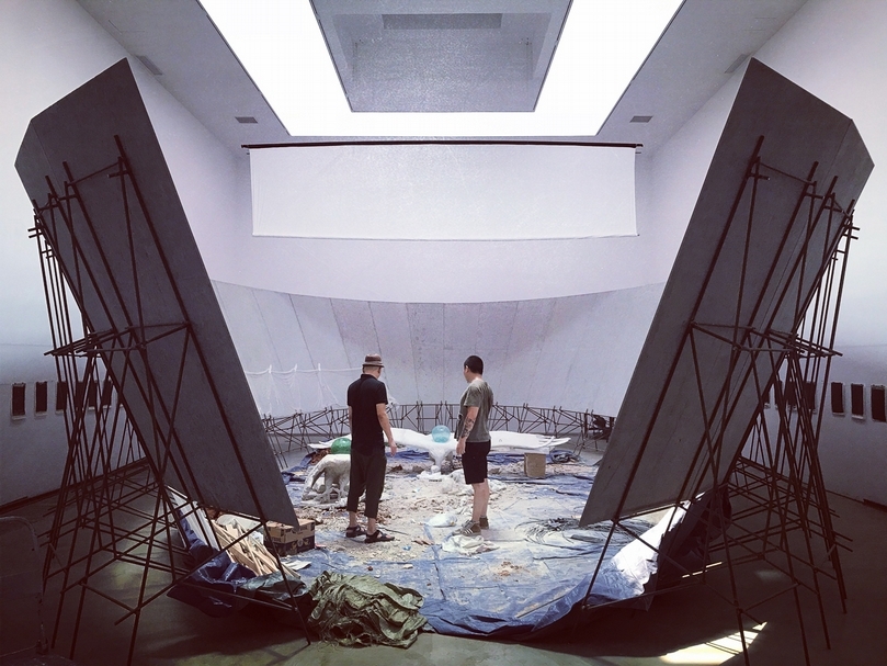 藝術家們的命運更多地與同處這座城市的畫廊和美術館有關,藝術家個體無法擺脫機構、策展人、藝術家集群構成的諸眾症候。即便北京很糟糕,但誰都無法離開這裡另起爐灶,藝術家們置身城市變革這個漩渦之中時,他們努力地將自己從其中抽離出來,忘卻疲憊和艱難。然後看著這個漩渦,並把它想像成拿鐵咖啡表面的螺旋形拉花。所以在粗魯的城市擴張衍生出的野蠻和無序感裡,我們好像還可以讀出一些美感——某種材料或裝飾。目前在UCCA進行的徐冰大展中生銹的腳手架(鷹架)和破木板被文化演繹為一種情懷;長征空間的「違章建築三——特區」中,社會的高速發展及其亂象被技術性分析並附加了趣味共情;石青、曾巨集等人在單行道空間製造了一個「施工工地」,並在裡面進行持續一個月的展覽生產和表演⋯⋯這些項目差不多都在同一時間段發生,在藝術機構裡,表演性的現場重建過濾掉了身體創痛,是觀看的視角而非設身處地。