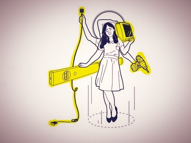 第286期《典藏.今藝術》專題「為何我們逃不出過勞──藝術行政職災自救手冊」插圖。(繪圖/劉致宏)