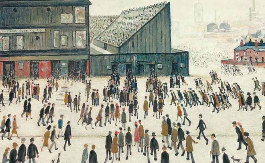 當然,既然球迷有第12人(the 12th man)的說法,是場上11名球員的精神支柱,以足球為主題的藝術,又豈能在英雄之外,讓粉絲缺席?勞倫斯.洛瑞(Lawrence S. Lowry)是英國最為人知的畫家之一,以英國北方工業城市地景和被暱稱為火柴人的人物描繪著稱。他終身居於大曼徹斯特地區,也是曼城球隊(Manchester City)的忠實支持者。1999年,英格蘭職業足球運動員協會(Professional Footballers’ Association)以近200萬英鎊買下洛瑞的《看球去》(Going to the Match),打破20世紀英國現當代繪畫最高價紀錄,此後洛瑞的球賽作品在拍賣會中屢創天價。他筆下成百上千的球迷豎起衣領,在瑟蕭的天氣中奔赴球場觀賽的景象,早已成為英國、甚或世界足球的經典代言。