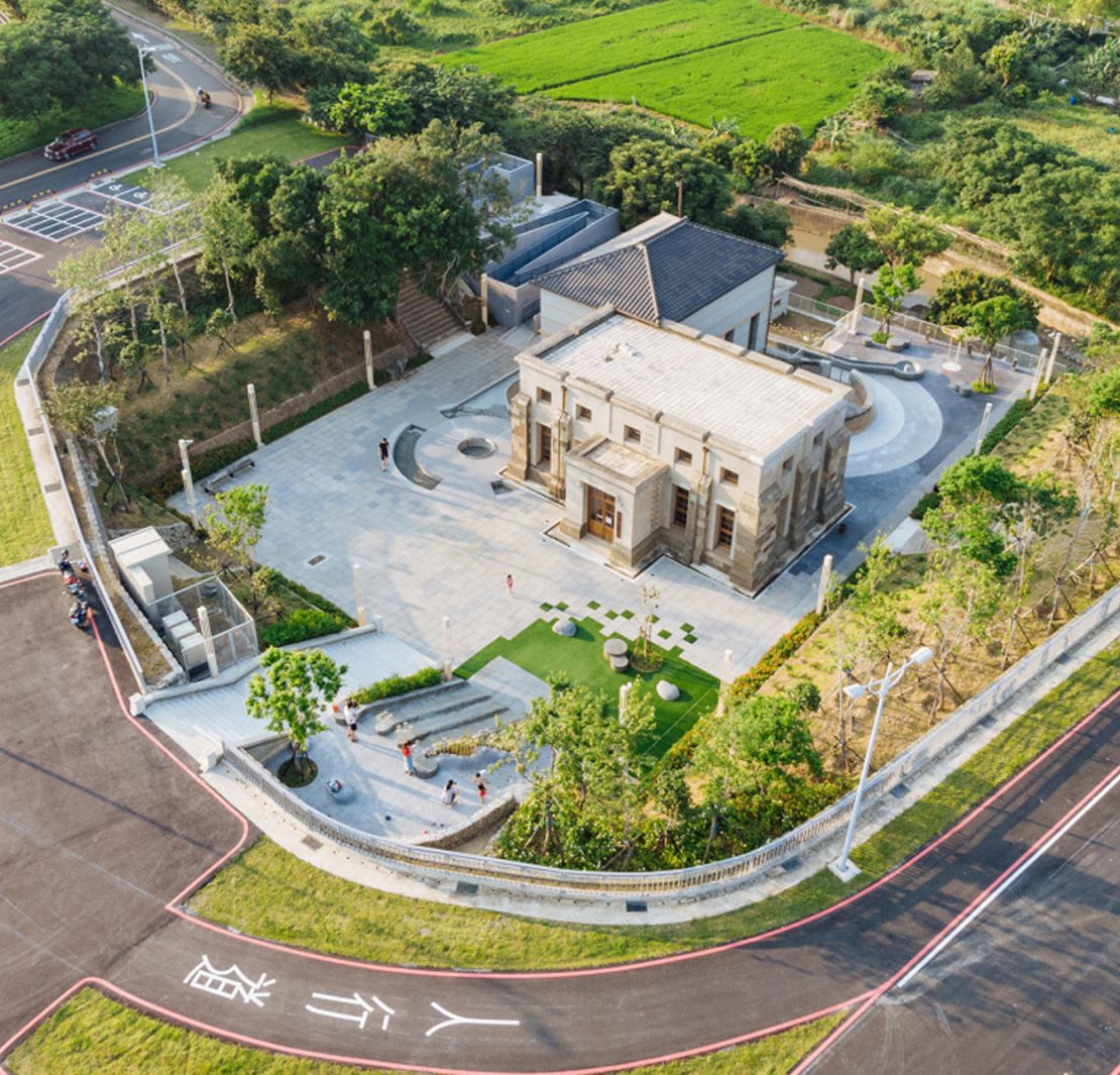 負責景觀設計的王士芳建築師事務所,將遊戲場帶入古蹟周邊,讓遊戲成為認識「水」的自然體驗,也藉此吸引大朋友有朋友來此「活化古蹟」。在走入古蹟建築前,向下樓梯的一旁,有一座大型的磨石子溜滑梯與地景攀爬坡道,這是順應現地具有高低差的地形而設計的遊戲場所,也在一般樓梯入口之外,有了有趣的入口設計方案。在取水口展示館古蹟的周邊,以流動的水圍繞,圓弧形的水道成為了指引的動線,來參訪的大小朋友除了可以下水玩水嬉戲外,水道的水也照地勢的起伏往低處流,在出水處放一艘紙船、一片葉子,則可以繞著古蹟跟著流動,感受認識水與重力的關係的同時,也能從各角度看看這歷史建築的細節樣貌。