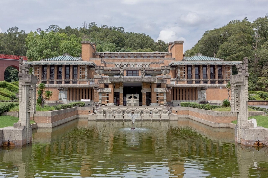 日本博物館明治村(Museum Meiji-Mura)中,萊特(Frank Lloyd Wright)所設計的東京帝國飯店大廳及入口處倒映池。(©Morio)