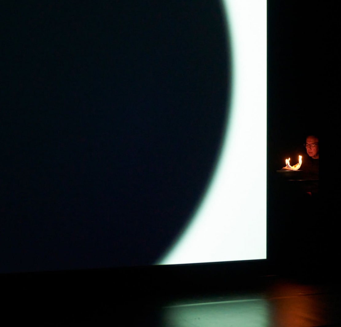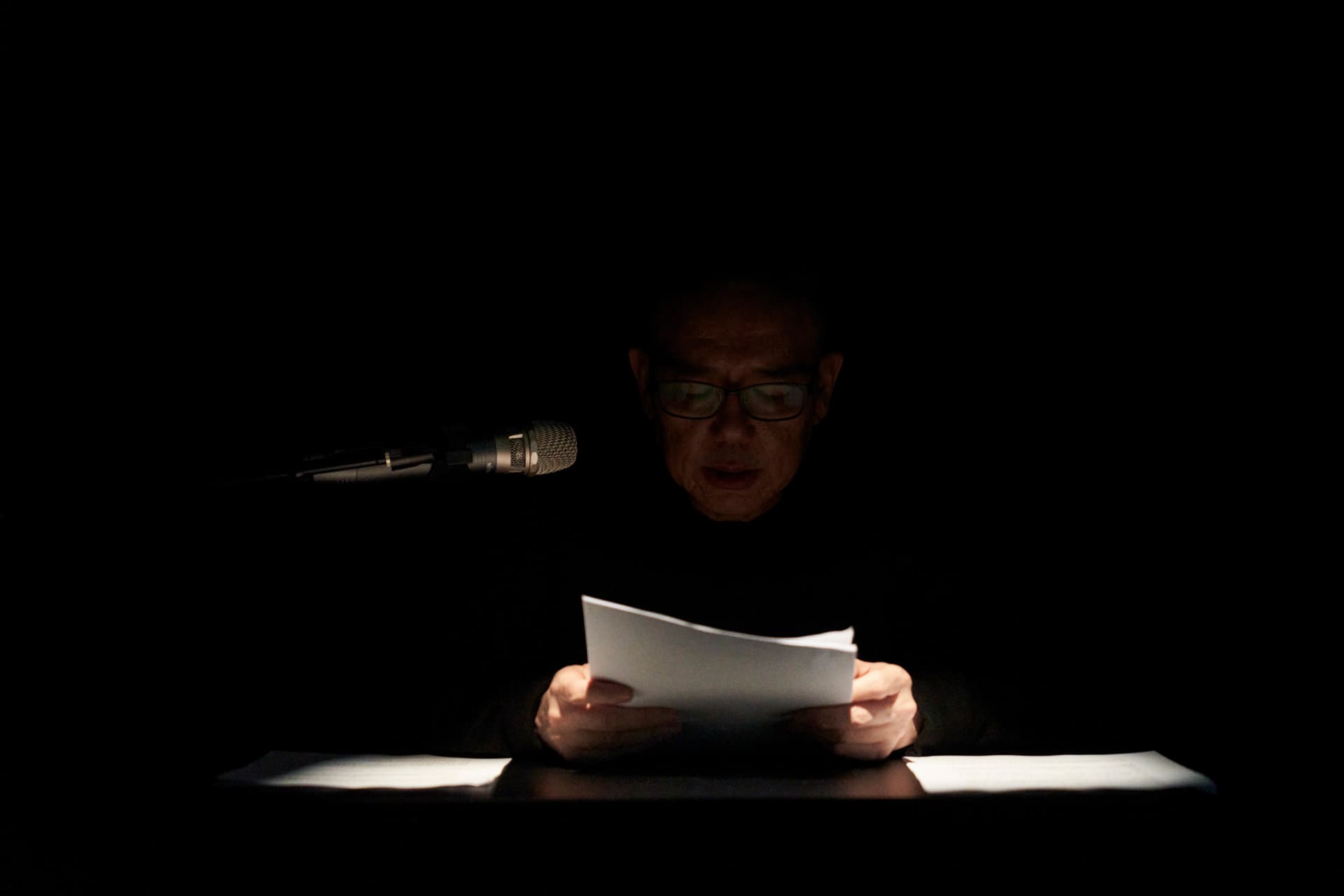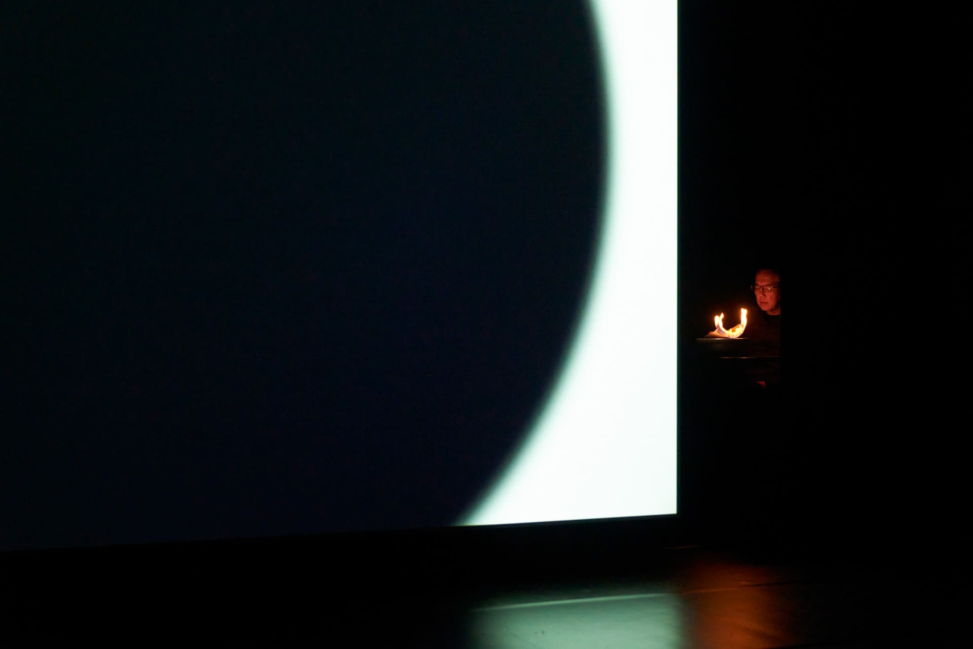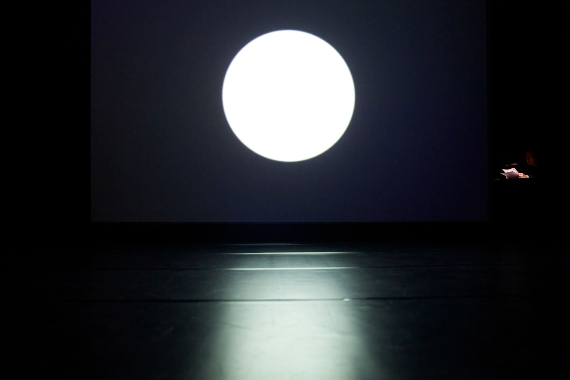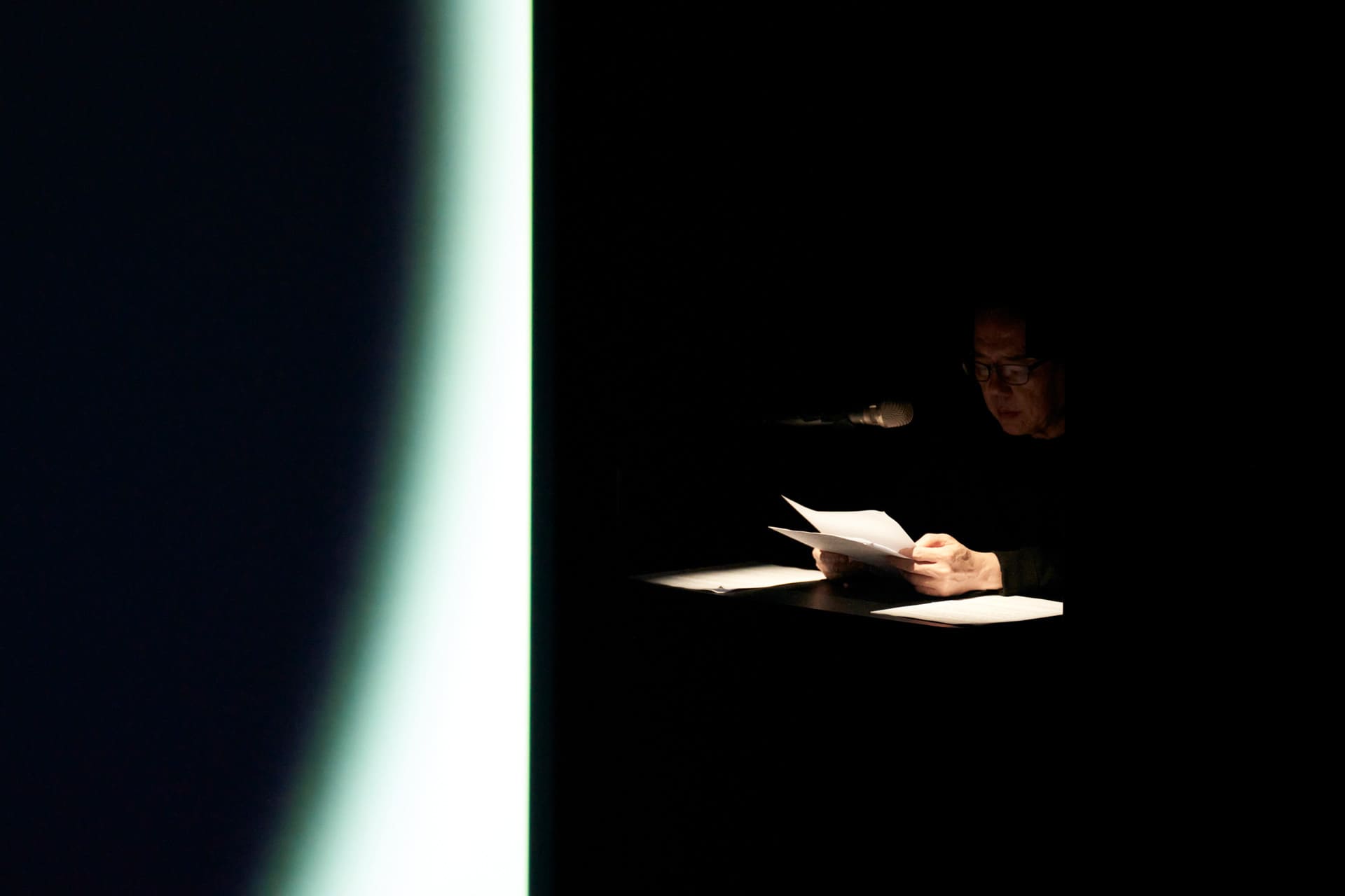 儘管如此,這一次要陳界仁從橫亙在歷史與未來、前衛與藝術,世界與自我之間的《再現空白》中提煉出政治與美學訓諭,並非是一件輕而易舉、一蹴而得的事情。這是由於比起先前其他作品,題旨無論多麼融合家族生命史與恢宏政治論題,都沒有比新作題材是直接觸及數月前才仙逝的親人——藝術家母親鄭寶玉——而來得椎心泣血。所以,陳界仁將亡母作為新作主體,這除了哀悼,肯定是只能透過她才能傾吐的重大意義。這也就難怪《再現空白》的主要展演方式奠基於藝術家獻給亡母的祭弔文。電影表演伊始,觀眾面對的銀幕上,先後來回輪轉著一個從小黑點逐漸變大、擴大直至佔滿銀幕,又換成另一個小白點逐步變大、擴大直到佈滿銀幕的畫面。同時,現場伴隨著由陳懋璋所作的低迴且重覆性的聲響。影像與聲音,一邊是黑白光影交替復現、閃動不止;另一邊,則是彼此疊合穿透,忽離忽合,形成低限。在它們之間,陳界仁藏身於舞台後方,他與觀眾位置之間隔著一個透著微光的方形框格,只見露出藝術家持著講稿的手,竟以幻聲(acousmêtre)般的壓低著聲量、鬱悶的音調唸著:「天剛微亮,手機就響起,小弟在電話中說:『早上起床後,發現媽媽已在睡夢中走了……』」。從此,既開啟一篇由母親離世、接連串起藝術家片段身世的祭弔文,更揭開了一場長達近90分鐘伴隨著聲光影明滅不定且穿越著家族回憶與佛學思辯的演講表演(lecture performance)。