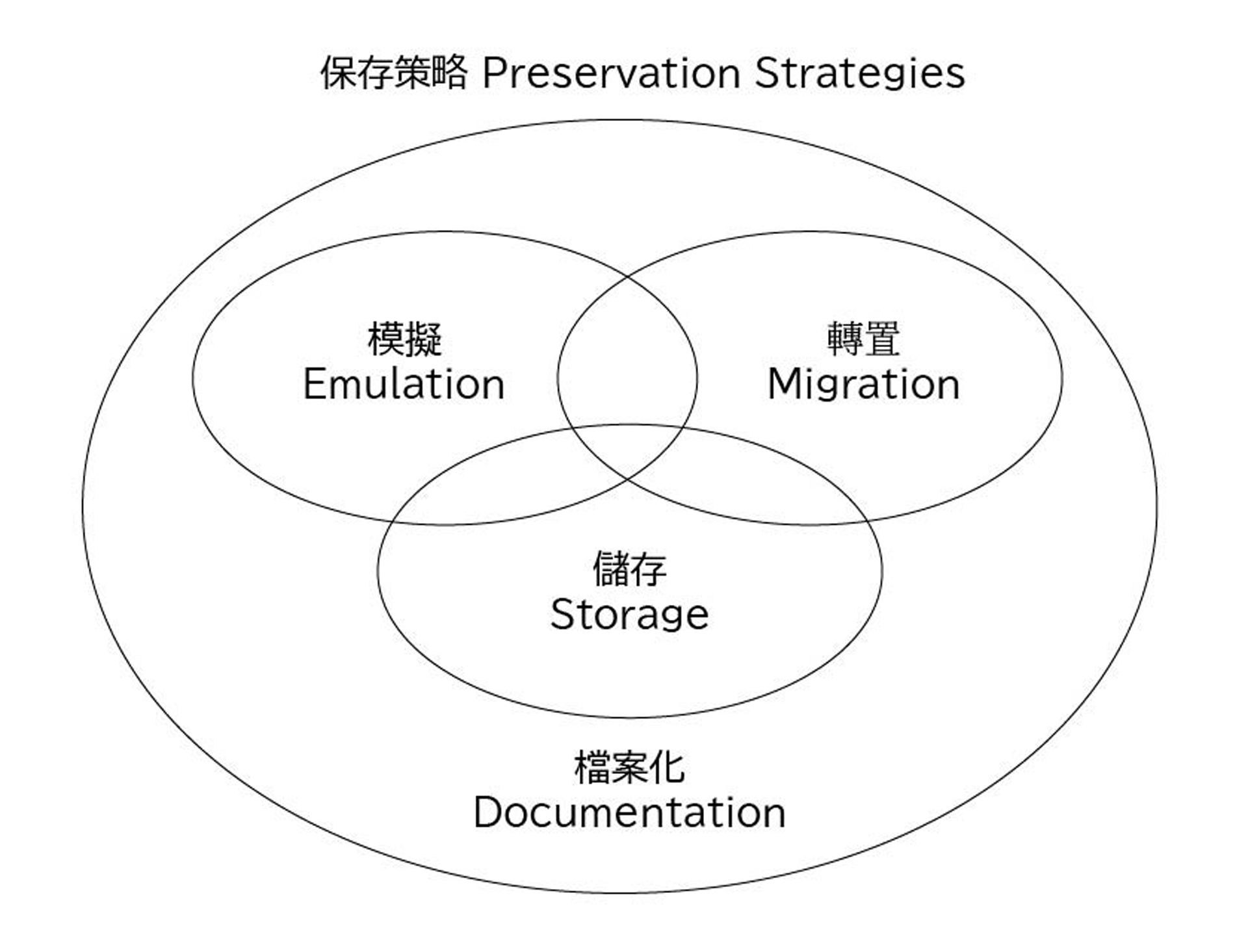 現在的時基媒體藝術修復師(註8)普遍認同以下增修自數位保存(digital preservation)領域(註9)的四大策略,在此引用《Re-Collection: Art, New Media, and Social Memory》一書中,(註10)由策展人Jon Ippolito所整理的定義: