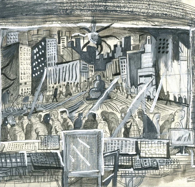 攪乳海是印度神話中一個關鍵的場面,而當今的關鍵畫面都是在視窗裡發生的,因此我把祂們都放進框裡,飛天們散播著的假新聞則像廣告視窗一樣關不掉,無限增生。正派跟反派都有者一樣的臉孔,身形相等,沒有絕對正和負,隨時都得調換過來的。我特別喜歡作者討論的「雜訊」,雜訊吵鬧猖狂,看起來多麽的惡,但正因為雜訊的出現,意識形態之間有了關係,而得以有社會性的誕生。