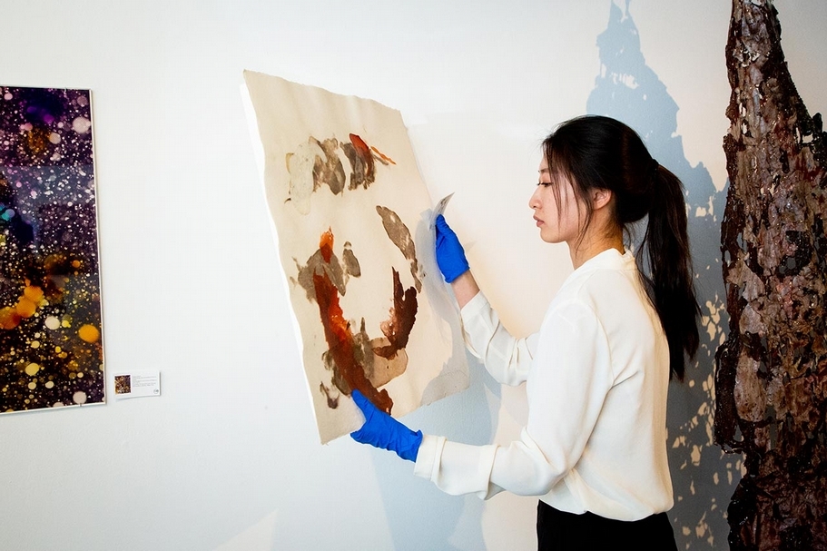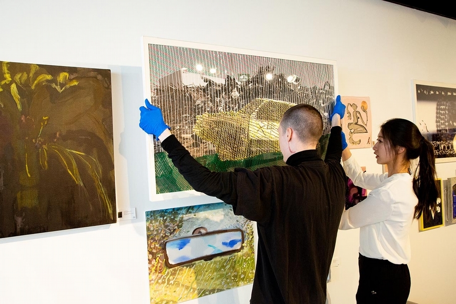 「好運抽」(Lucky Draw)募款義賣活動現場工作人員將持票者認領的作品搬離現場。(攝影/Mina Magda,Sculpture Center提供)