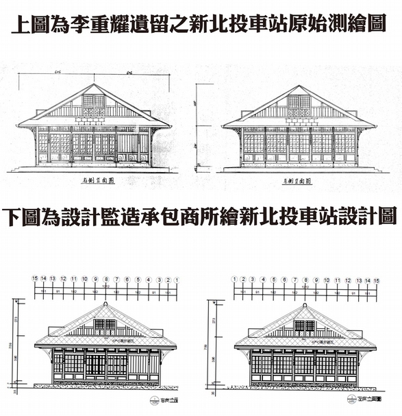 目前新北投車站重組設計圖與建築師李重耀留下之測繪圖不符,台北市文化局無法提出說明。(蕭文杰提供)