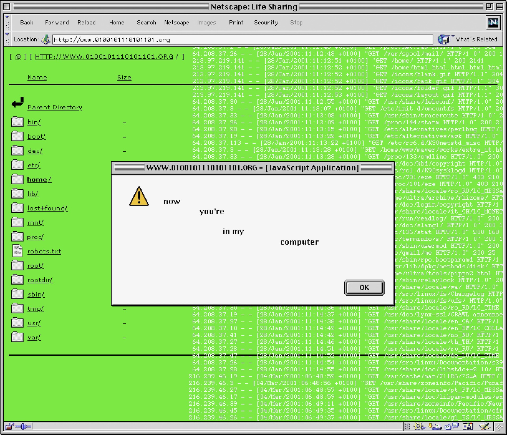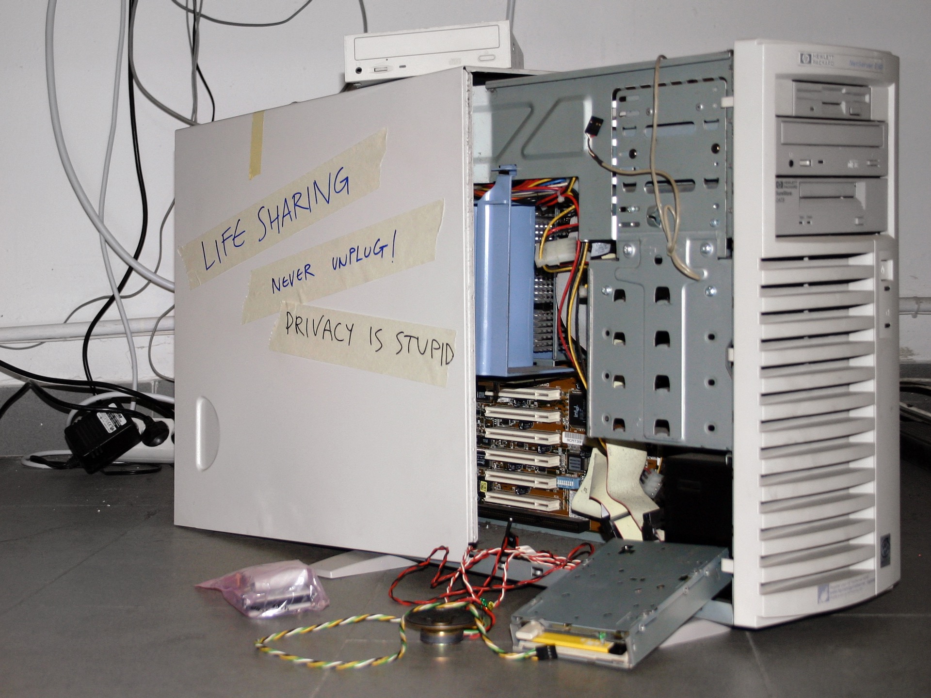 義大利藝術雙人組Eva & Franco Mattes(亦稱「0100101110101101.org」)的《分享生活》(Life Sharing,2000-2003)持續三年多的時間,把家中電腦裡所有資料公開在網路上,開放觀看與下載權限,並同步更新。只要登入《分享生活》的作品網站,即可以一覽無遺他們的帳單、電子郵件、聯絡人、圖片、銀行帳號密碼等,整台電腦成了活藝術的展演現場與媒介。有的觀眾為了驗證資料的真實性,會做出冒犯他人隱私的舉動,但弔詭的是,藝術家又授權觀眾「享用」他們的「生活」。「公開」與「隱私」的區辨是什麼?這是活在影像裡的生活還是生活化的影像?當「生活」在這兩個圖層之間,生活的非物質性及網路螢幕裡物質化的視覺文本,逐漸變得沒有區別。於是在觀眾汲取、瀏覽藝術家電腦的同時,那些數據、文字與圖像變成藝術家的赤身裸體,原來「sharing」作為副本的意義被重新編碼,史戴爾因而形容這件一絲不掛的作品,是一部抽象的色情片。