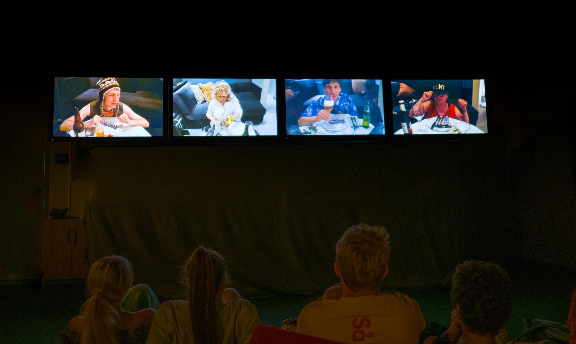 2003年,英國Gob Squad劇團將觀眾邀請到一間旅館的交誼廳,散坐在沙發或椅上子,面向牆上數台閉路電視。旅館的四間客房間裡分別住著四名準備過夜的演員,在網路攝影機(簡稱「webcam」)的監視下,房間裡發生的一切都將被即時播送到交誼廳的電視螢幕裡。在這場長達六小時的《客房服務》(Room Service)演出過程中,演員對著鏡頭表演,譬如不斷換裝走秀或一個人跳舞打發時間。演員還可以透過客房電話與觀眾通話,甚至邀請觀眾入房「實體」互動,幫助他們渡過長夜。這件作品運用webcam微妙地接合了線上(房間/舞台)與線下(交誼廳/觀眾席)的表演空間。它保有鏡頭、螢幕所框架的第四面牆,亦同時擾動通常劇場配置裡單向的觀演關係,讓觀眾參與了扮演、行動及敘事發展。