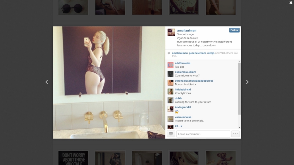 阿根廷藝術家阿馬利亞.烏爾曼(Amalia Ulman)的網路表演《卓越與完美》(Excellences and Perfections,2014)即展示了上述這項矛盾。她在Instagram上開設了同名帳號,發表的第一張圖片是白色背景搭配黑字「Part 1」,圖說是「卓越與完美」,得到28個讚。接著四個月左右的一百多張照片是一系列在更衣鏡、在浴室鏡子、在舞蹈教室鏡子、在電梯鏡子、在床上、在雅緻餐桌前的網美擺拍,搭配標籤「#simple」、 「#cutegasm」、「#hotbabe」等。透過精密的場景與道具佈局,實際上烏爾曼創造了一個網路角色:一個搬到大城市追求夢想與成功的鄉下女孩、節食並學鋼管舞鍛鍊身材、男友太窮分手、素顏美、如何時尚穿搭、買名牌只是剛好、隆乳與穿高岔丁字褲是愛自己的表現等等。她打造自己成為刻板的性感「白富美」,最後吸引了約九萬追蹤者,也引來眾多酸民的謾罵與批評。最後她發表了一張「The End」 圖文,揭露這一切都不是真的,計畫完成接著帳號關閉。信以為真的網友感覺被騙了,但,烏爾曼做的與其他網美並無二致。當人們問這是哪門子藝術時,我們或可想:線上影像裡隨從優勢文化霸權女性形象的網紅烏爾曼,與線下生活裡協商閱讀的藝術家烏爾曼可不可以是同一個人?她有沒有可能真心信仰那種主流美,卻可以同時是一個女權主義者?白富美的惡,是她的還是觀看者造成的?烏爾曼拋出的創作提問是,如何達致將本體與分身、原件與副本、真實與虛構不再分為兩端的社交及通訊協定。