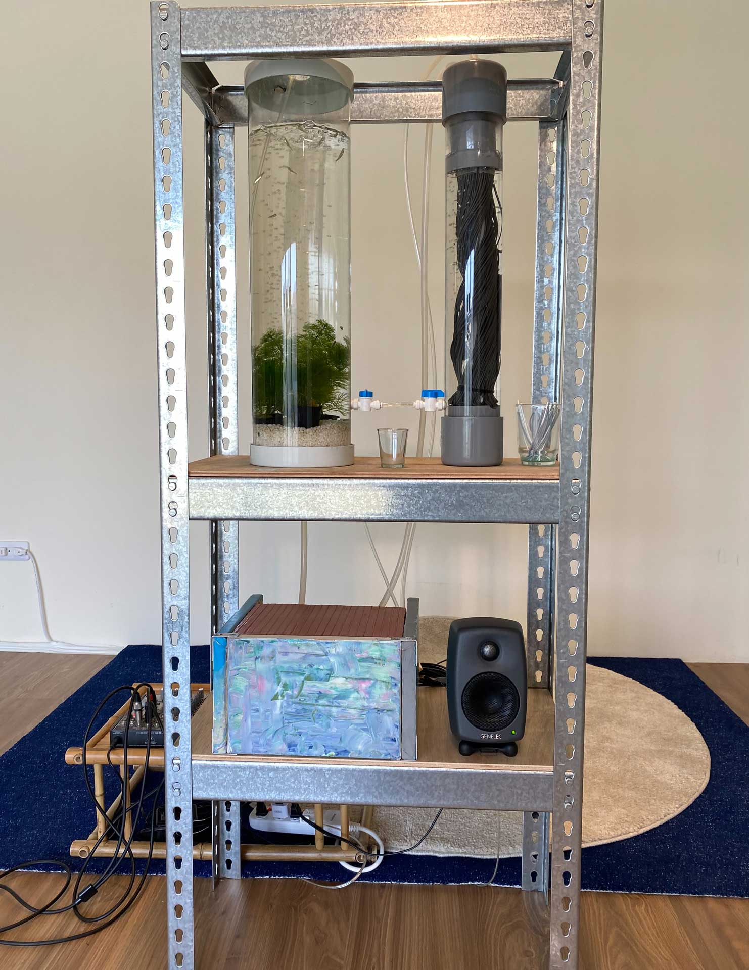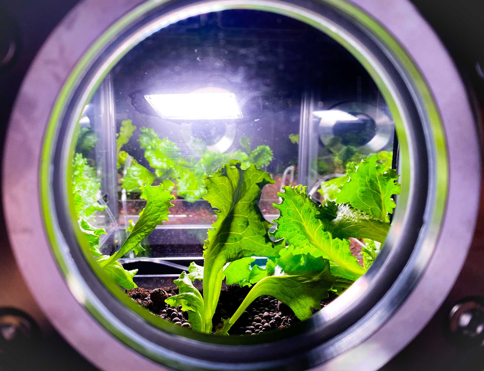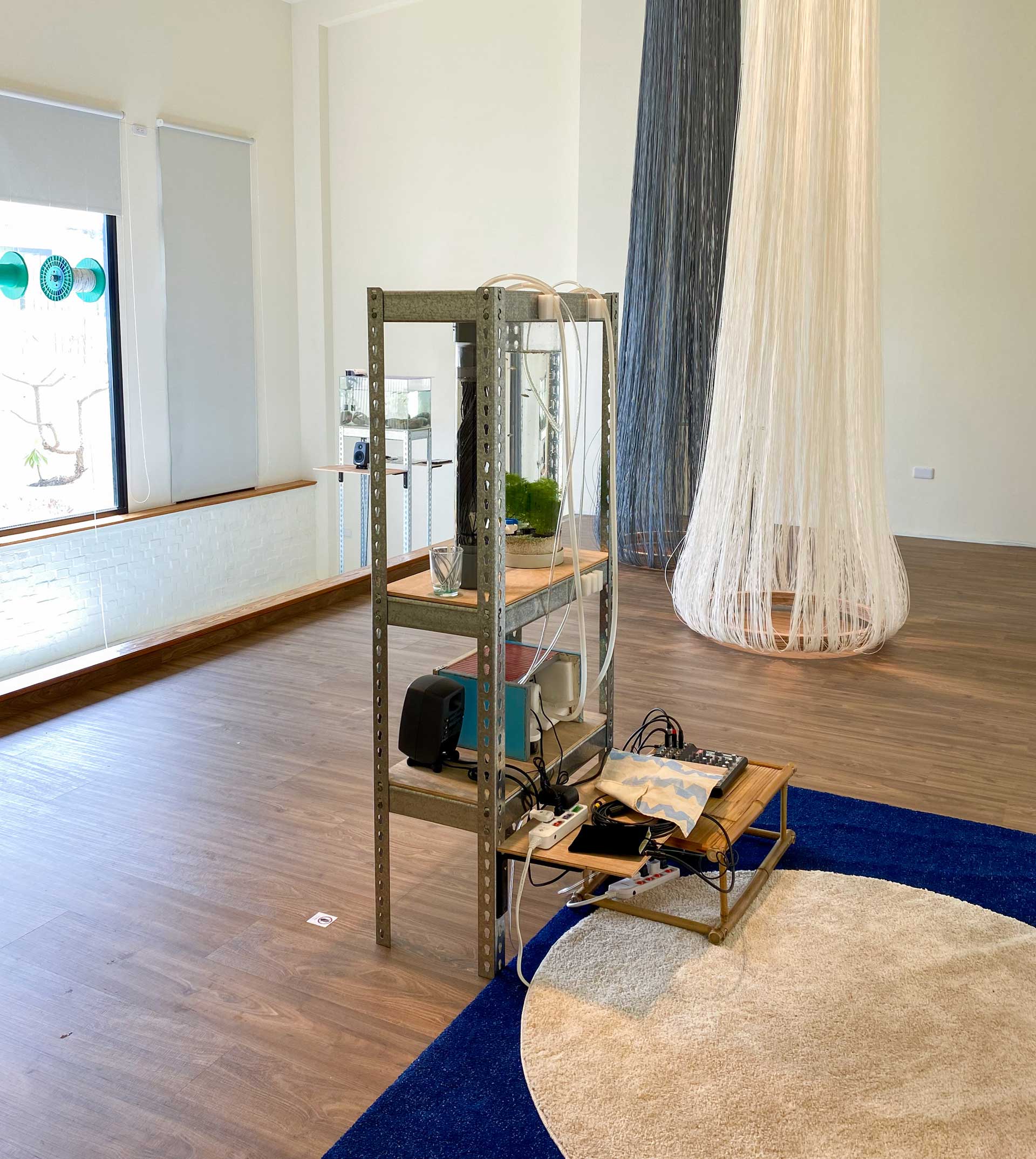 註5 「Holobiont」為完整的生命全體(whole unit of life)的概念,指涉眾多生物集合所構建、共生的複合體。藝術家江俊毅使用媒材包括了微生物、作物、土壤、菌液、水、鋁擠、不鏽鋼、玻璃、凸透鏡、植物燈、馬達、風扇、管線、震盪器等。