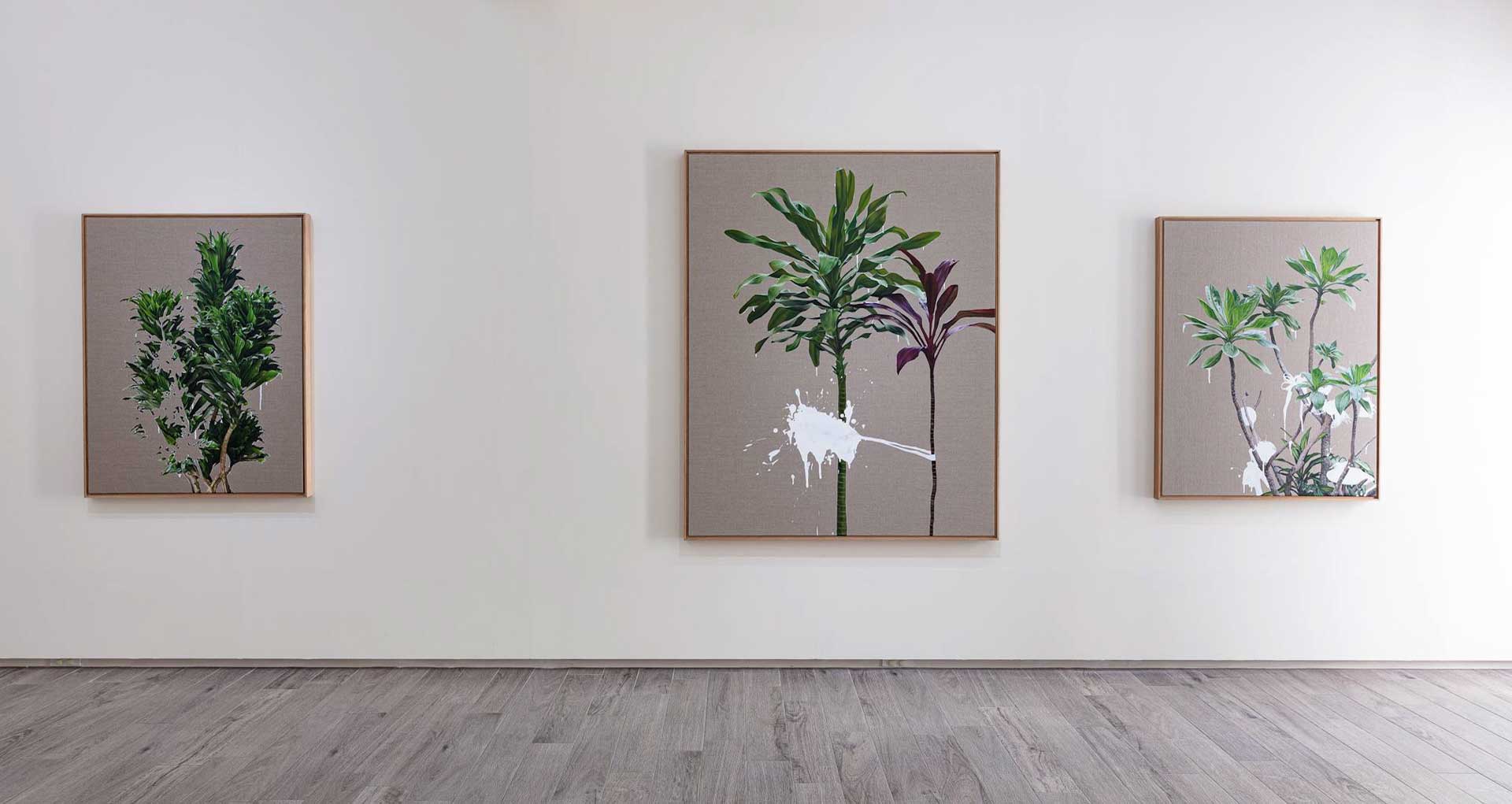 「你覺得這是一種風景畫嗎?」藝術家想一下,回答「是的」。這三幅畫面分別畫了南島庭園、街頭、室內常見的密葉竹蕉、香龍血樹與朱蕉、白水木。沒有背景,只有寫實的植物肖像、抽離與潑灑的飛白破相。它們像是市井的油畫版清供圖、既賦色又留白的人工景物、手繪的手機屏幕色感仿擬、數位年代的繪畫性顯像研究。自然,因南島植物的形態,也賦予畫面一種在地感。在沒有景觀背景下,此在地感是如何產生?是緯度滋養的密葉竹蕉、香龍血樹、朱蕉、白水木所提供的地方感,還是它們已成為藝術家的一個幻肢-從肉眼、手機鏡頭、網站圖檔的色光比較中,有了所在的生活景象?