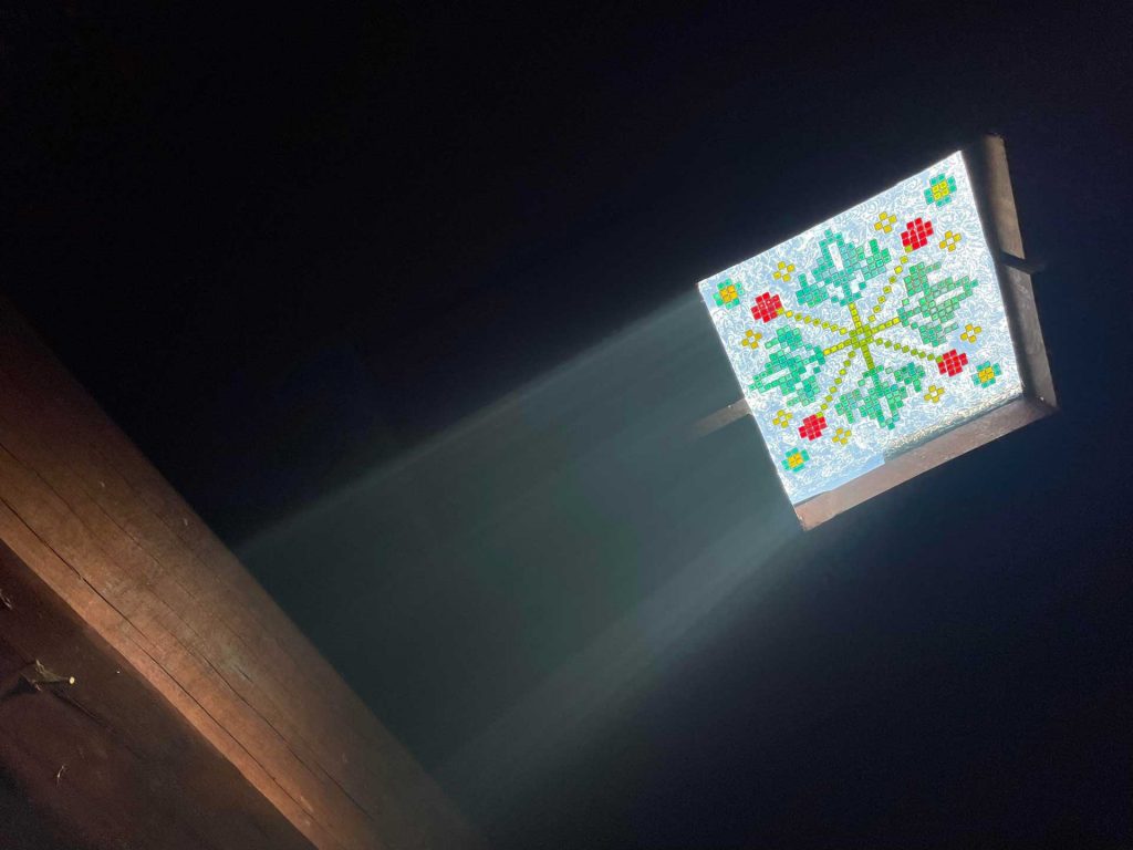 展覽開幕之後,在家屋空間的分配上有所調整,從司降一人的生活起居空間轉變成展覽空間。司降具有生活痕跡的物件被刻意地妥善安置,張恩滿也必須直接讓作品與空間對話,減少投影布幕等展覽物件的干擾,她選擇將影像作品直接投影於石板之上。我拜訪此一家屋的時間是日正當中,家屋內最明顯的除了生火而產生的煙霧繚繞之外,另一個是十字繡圖樣的彩色玻璃天窗,射入一道具體的光束,從屋頂直抵地面,有種教堂的神聖氛圍。相對地,投影於石板上的影像反而在天光之下顯得泛白,影響影像的清晰度。然而,這個選擇即是以家屋整體生活感為主體,影像作品為輔。