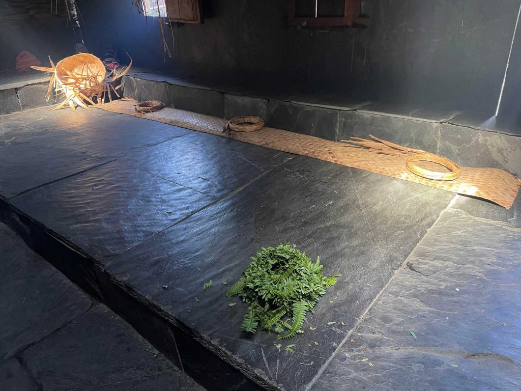 司降在屋內的生活,透過生火、燻煙、走動、做事、睡覺等,給這棟未曾有過人氣的家屋「人的氣息」,開始有家屋該有的「家的氣味」。隨著展覽期間的拉長,人的氣息越來越重,人與家屋的關係就像在屋內生火一般,煙霧瀰漫、擴散浸染每個物件、每片石板、每個角落。被稱為會呼吸的房子的石板屋就需要人住在其中,生火是維持這個建物重要的事,煙既除菌去蟲,也是一種與「靈」照面的儀式。透過點火燃煙,司降的「進駐/住」召喚「靈」,既讓家屋有靈,也讓生活/藝術在其中讓靈彰顯,被感受。