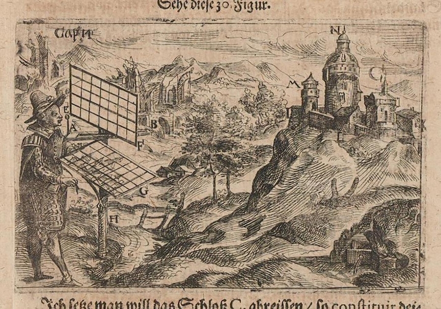 列維勒斯.胡西屋斯(Levinus Hulsius)介紹如何用「網格」來複製遠方的城堡。(© ETH-Bibliothek)
