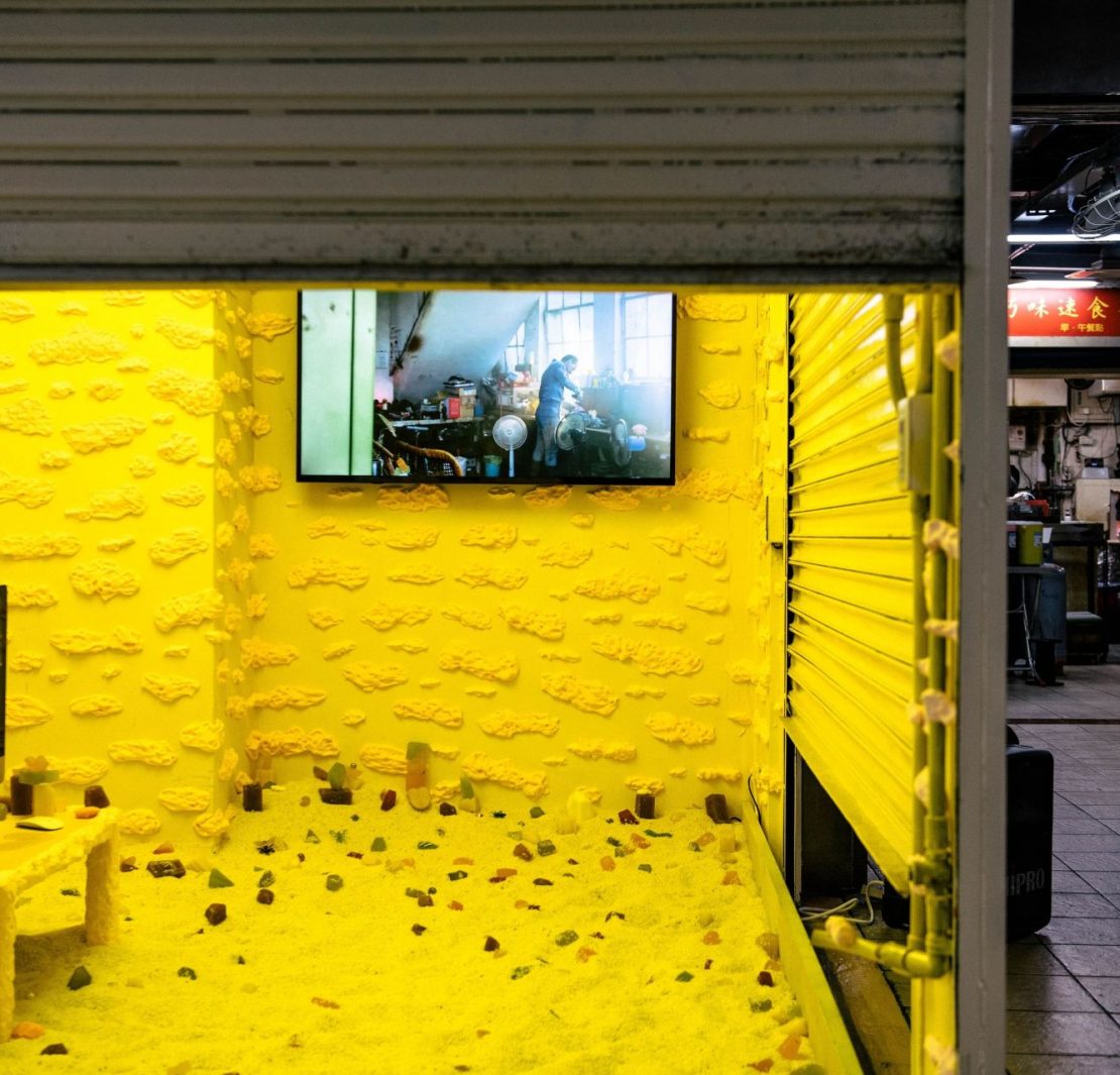 在「當代知識的下鄉傳播」與「訊息的淫穢式擴散」中,布迪厄檢視社會階層和美學品味的「秀異」(distinction)關係裡,「市場」即可視為一個重要的產生場域。早在2009年,張碩尹便曾在龍泉市場與古亭市場舉辦過突擊式的《蔬果菜大學》。2020年,張碩尹、鄭先喻、廖銘和(Dino)合作的《台北機電人2.0:訊息瘟疫》有二個展場,其一是台電大樓附近的龍泉市場。在「訊息瘟疫」一詞下,「市場之地」有了另一層的象徵性。以「傳播感染」為主題,2020年下半年,張碩尹的「肥皂」計畫,再度以一戰的假新聞事件「肥皂工廠」為文本,(註6)搭造一個生產肥皂的工業環境,指涉資訊如何被規模化的生產,與其在媒體與社交平台的流竄狀態。這個計畫雖利用了數位網路的流動性,但其實體空間則選在萬華區的西寧市場,寓指了市場本身的傳播性與隱蔽性。(註7)