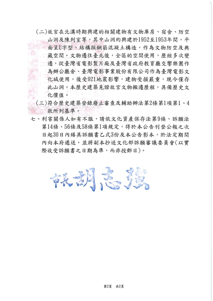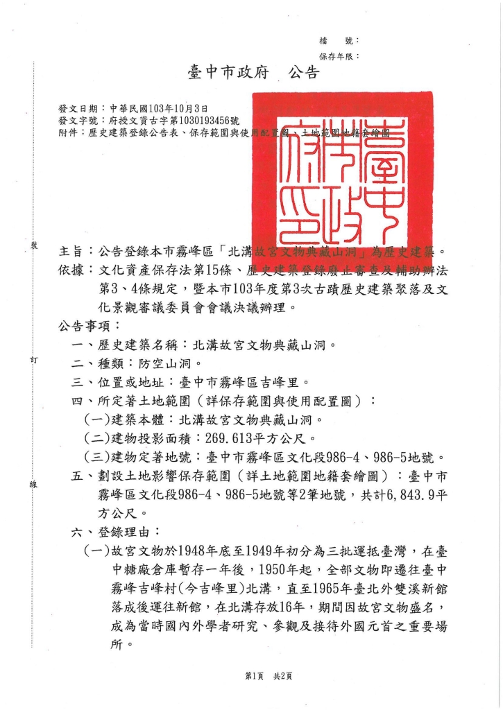 1. 既然台中市政府登錄「北溝故宮文物典藏山洞」為歷史建築,政府機關就必須依照《憲法》、《文資法》積極保留這樣歷史地景。若文化局、台中文資處怠惰,市長應進行懲處。