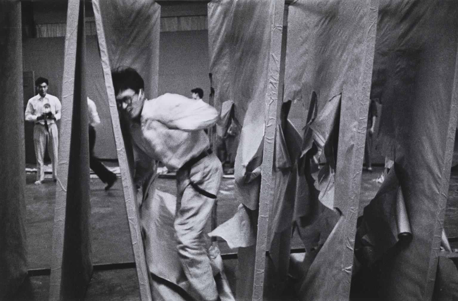 於是,當田中敦子穿戴電氣裝、村上三郎穿破畫紙、白髮一雄以雙足作畫、元永定正在劇場舞台上釋放煙霧、嶋本昭三丟擲顏料罐等(註8),以身體行動為基礎(action-based)的(視覺藝術)作品展示,無一不是藉由「表演」的語境來創造出「集體性」、「展覽」與「觀演關係」被理解的可能與機會。其中1955與1956年所策劃的兩次戶外展覽及「舞台上的具体派藝術」展(Gutai Art on the Stage)特意選擇了非藝廊空間,而是公園與會議廳的舞台作為身體、物材與空間相遇的路徑,用身體作為方法積極突圍了典型展覽條件與框限,混合了視覺與表演藝術的語彙,並測試了具有臨時事件與時間性的「表演」如何成為一種組織展覽、佈局作品及有意識地與藝術社群對話與聚會的實踐。