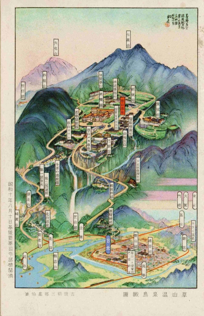 草山今稱陽明山,早期盛產硫磺,可製作火藥,日本人尚未治理台灣之前,聚落以硫磺開採及農業為主,唐山移民落腳後相繼開闢梯田種植大菁、茶葉營生。日治時期,日本人因雅好溫泉,逐漸開啟了草山文化景觀的改變,為了在幽邃深靜的山中,享受泡湯之樂,日人開始規劃汽車能通行的道路,同時也開始搭建溫泉旅館。臺灣總督田健治郎因計畫邀請日本皇太子裕仁來台,開啟有計畫的「迎奉」建設,總督府興建草山御賓館,打算供皇室成員使用。同時也規劃公路、電力設置路燈、設立郵便局,民間的株式會社也打著皇太子行啟名義,興建自己的招待所。(註1)
