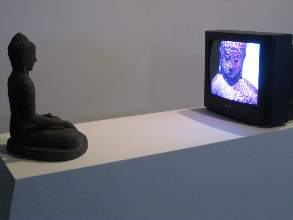 1974年,白南準回顧展的主題是《Nam June Paik:videa ‘n’ videology 1959–1973》。在當時,他已將「video」與「ideology」二詞合併,組出「Videology」一詞。此「Videology」是指一種錄像的物性意識,有些接近「機械物派」的理念。在《電視佛陀》(TV Buddha,1974)一作,藝術家又讓物質形象的佛性與科技形象的物性相互凝視,電視內容則不斷輪迴播放佛陀一生。