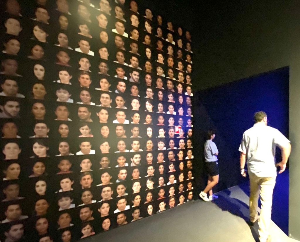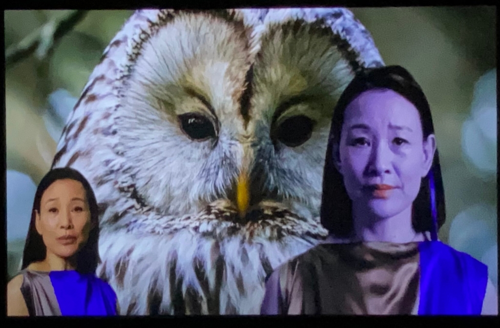 《邏輯麻痺了心臟》中的電子人形像,來自電視劇《雙峰》(Twin Peaks)的華裔演員陳沖。在軍械庫展區,單頻中的陳沖以擬人化的角色出現,四周充滿大量計算機生成的「AI」圖像。透過「iPhone」屏幕,她也是手機裡的角色。如果將之放大,會看到其臉部特寫鏡頭上,覆蓋著透明的幾何符號與液晶顯示器所用的字體。(註4)十年前,在《鏡面印刷系列–Missing Person,Cyborg,2011》一作,藝術家已透「AI」技術創建了不存在的肖像。她捕捉到一位凝視著鏡頭的金髮女子,其眼角和脖子上也有隱藏的微弱數字。