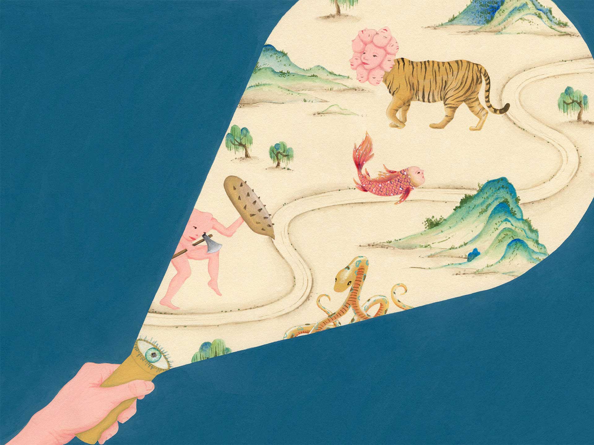 神話不在講述已發生的事或預言未來,而是提醒我們時間是不存在的,所有山海經裡的物種都可在每個現世以轉化後的形態被看見。人們朝聖奇珍異獸的真正目的,是在與自己體內並存的各種生物重新連結。前往「生技奇點養殖場」的方法就只要把眼睛像電燈開關一樣打開就行,從一個世界到另一個世界只是一瞬間,很簡單卻不見得容易。成功的人會覺知到宇宙萬物合一,知道了就無法不知道。失敗的人則成為追隨者,流連於自己創造出的人間,而忘了自己既是人、是鬼,也是神。