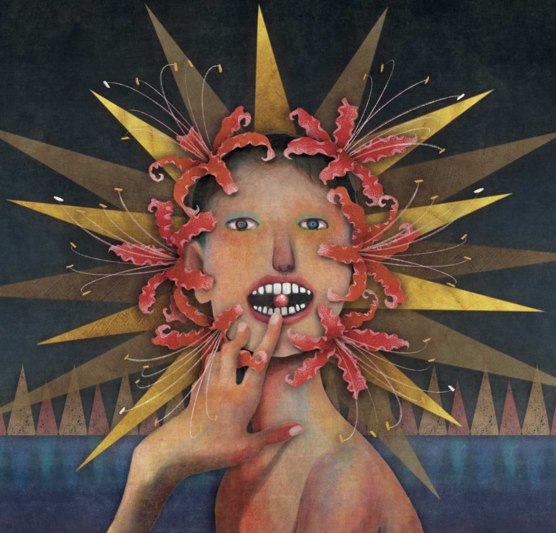 反覆讀了文字幾回後,一直對其中敘述紅色小藥丸與彼岸花的文字印象頗深,眼前浮現正要服下紅色小藥丸的「完美的終極之人」,於是畫下他以手指顫顫的送藥丸入口,在準備吞服、還猶豫地以唇齒咬著藥丸的瞬間,殷紅的彼岸花突然大綻,在耳邊鼓勵著他儘快吞下,準備迎接揉和後悔與驚奇、穿梭天堂地獄之間的刺激與狂喜。