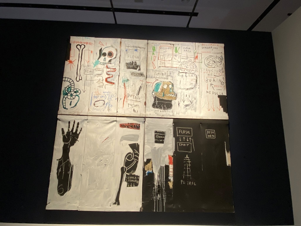在「解剖學」(ANATOMY)展區,則呈現巴斯奇亞1983年創作的傑作《肉體與精神,1982-1983》。該作品,由4個大畫面,12個畫板組成的作品,以「肉體」和「精神」為核心,把解剖學圖像,與非洲的精神象徵並置,探索生命與死亡、科學與信仰的邊界,作品中遍布骷髏、大腦、骨骼等圖像與宗教象徵,揭示了人類存在的矛盾與複雜性,引人深思。