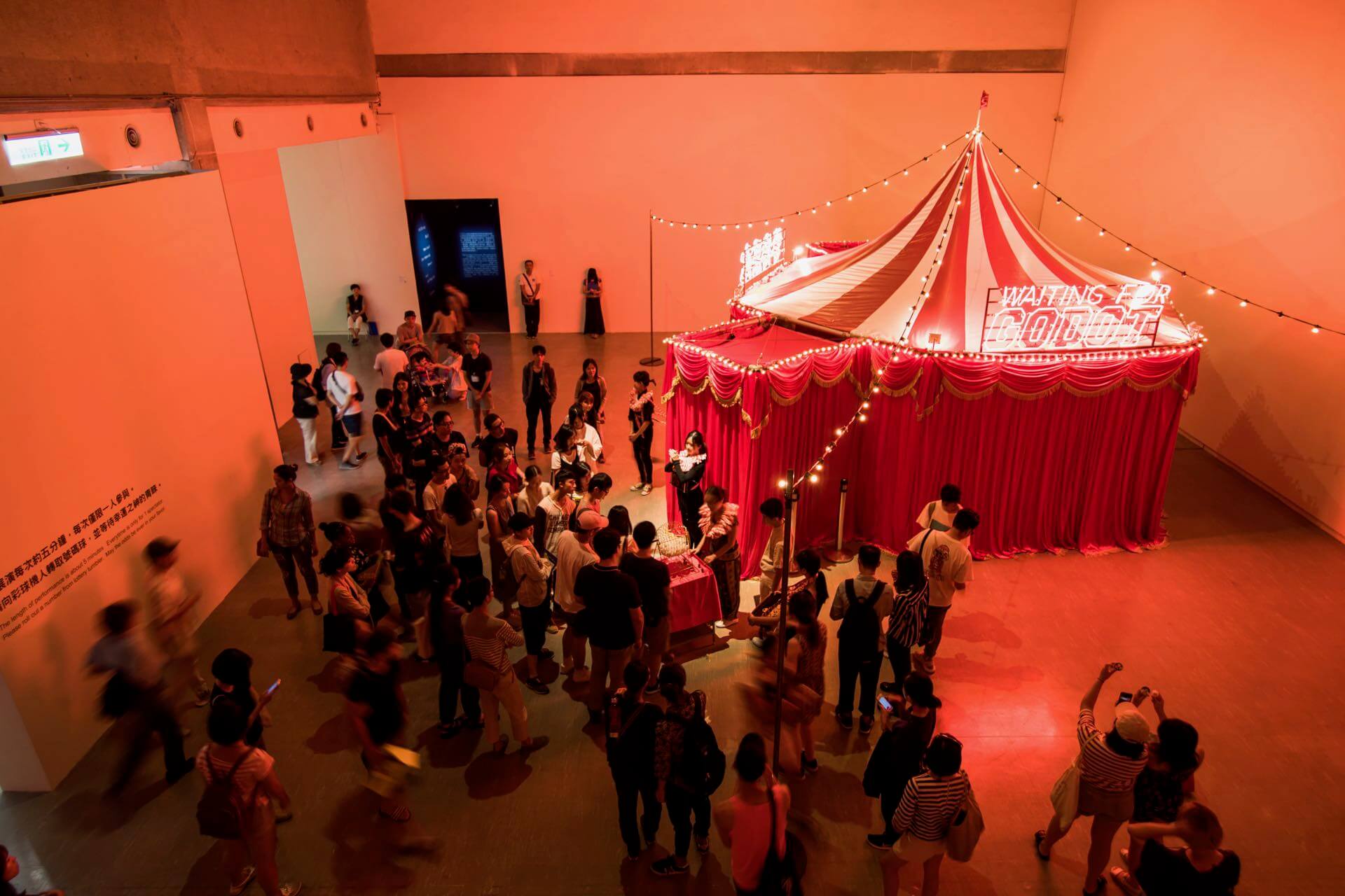 明日和合的《等待果陀》在帳篷入口處發放號碼牌,採用博彩方式,隨機選出能夠進入帳篷的觀眾。有些觀眾很幸運地能夠進入帳篷體驗;有些觀眾一直無法獲得幸運之神的青睞,縱使在展場等待了很久,還是沒能入內體驗;有些觀眾並不願意在場等待(不管時間多長),所以也可能遇到抽到號碼卻無人的狀況。